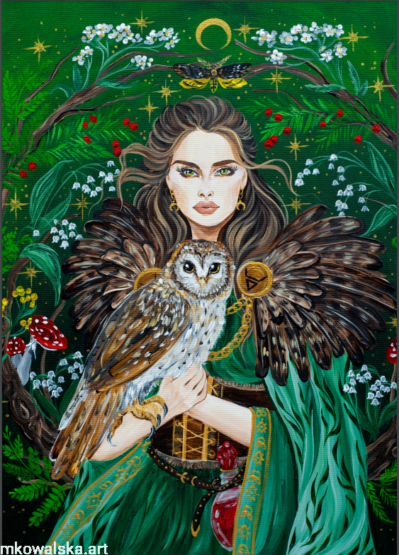 Nad strzygą unosi się ćma - zmierzchnica trupia główka, to właśnie delikatne nawiązanie do natury strzygi. W okrąg z gałęzi znajdujących się za strzygą wplotłam rośliny lecznicze, ale też trujące: krwawnik, cis, konwalia majowa, muchomor czerwony, wrotycz.