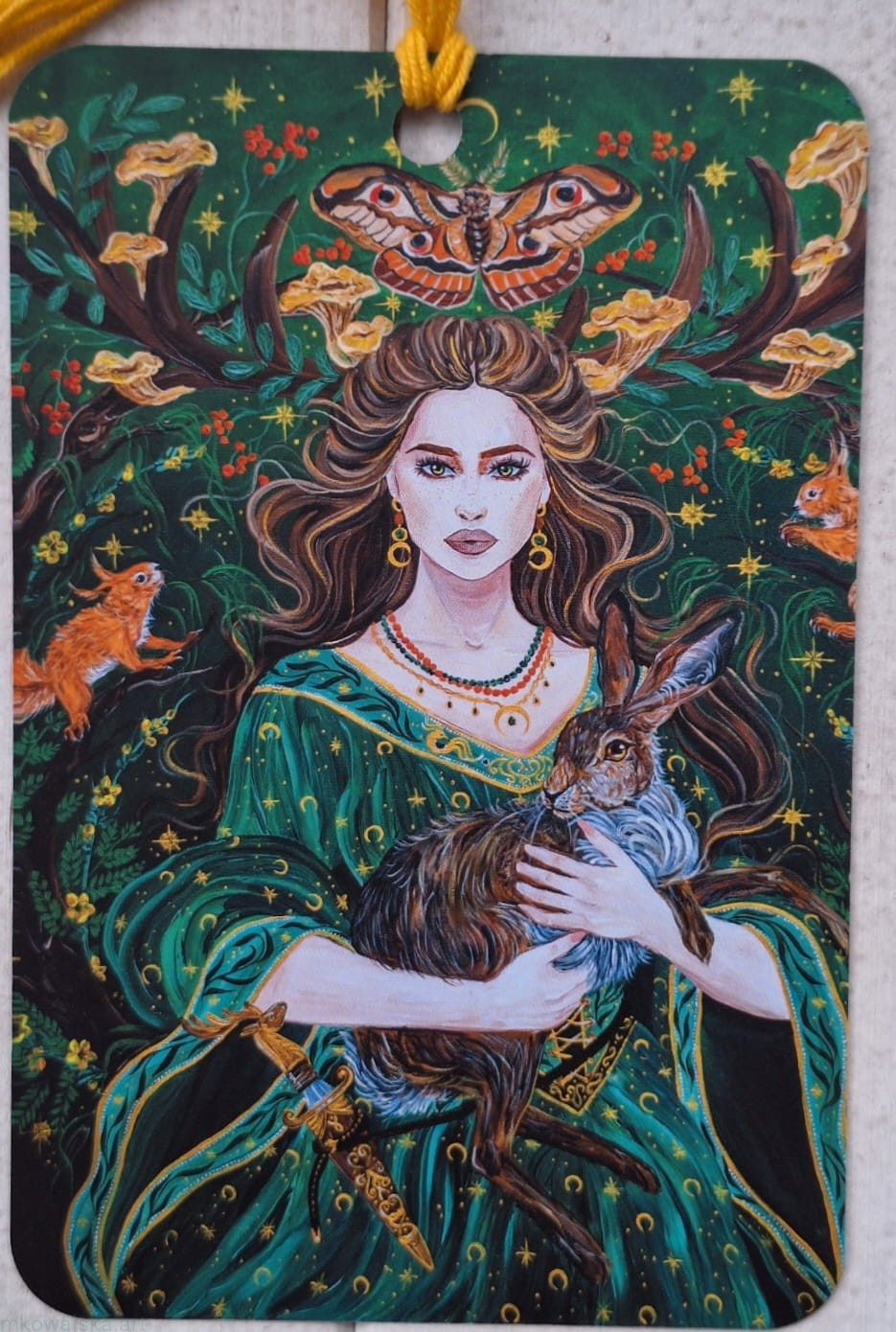 Dziewanna z zającem ma u pasa właśnie sztylet z głownią w kształcie głowy jelenia. W ramionach trzyma zająca (w książce Marty flaga kraju, w którym toczy się historia, jest koloru zielonego z symbolem zająca właśnie). W rogach znajdujących się na głowie Dziewanny wplotłam jarzębinę i leśne grzybki kurki. W okręgu z gałęzi drzewa, w tle Dziewanny znajdziesz kwiaty dziewanny (rośliny) oraz paprocie. Dodatkowo na obrazie umieściłam dwie wiewiórki, jako kolejny silny punkt kolorystyczny.