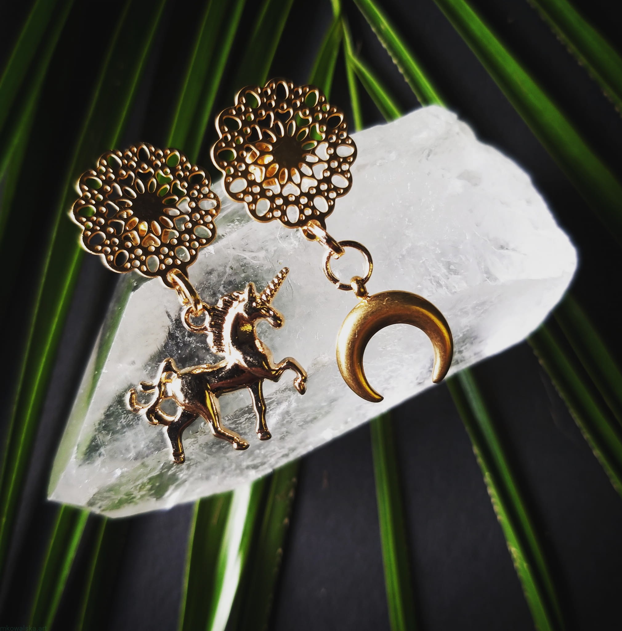 Magiczne kolczyki z jednorożcem i słowiańskim księżycem (lunulą), ucieleśniające moc kobiecości.