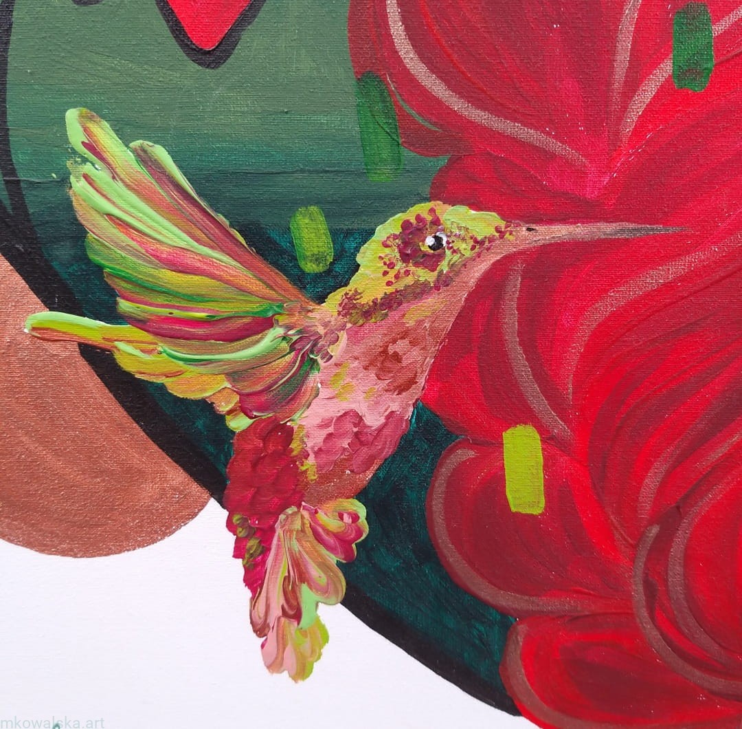 Dzięki zastosowaniu kontrastu dwóch kolorów (zielony i czerwony), obraz jest niesamowicie energetyczny. Świetnie sprawdzi się we wnętrzach miłośników natury i przyrody czy stylu jungle.