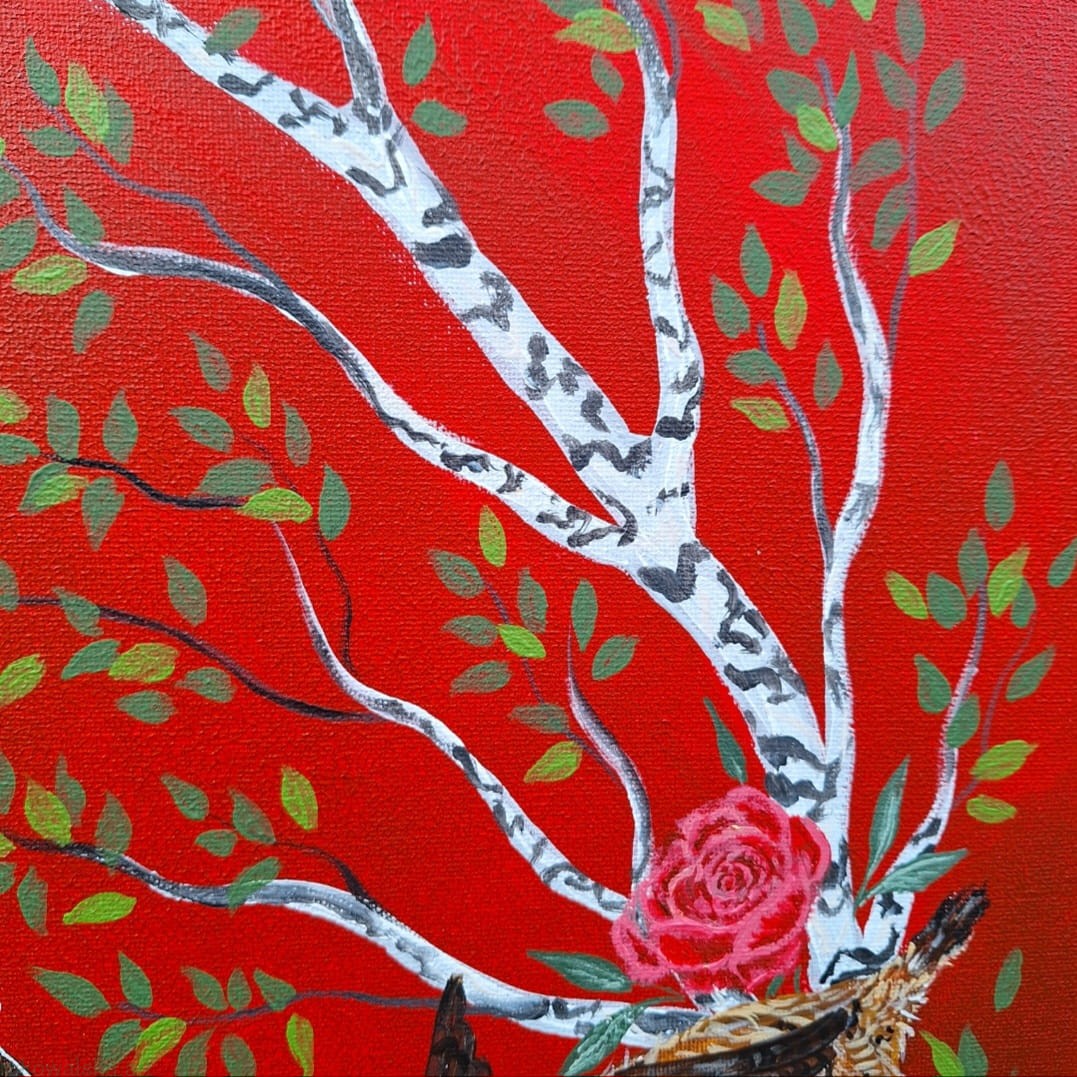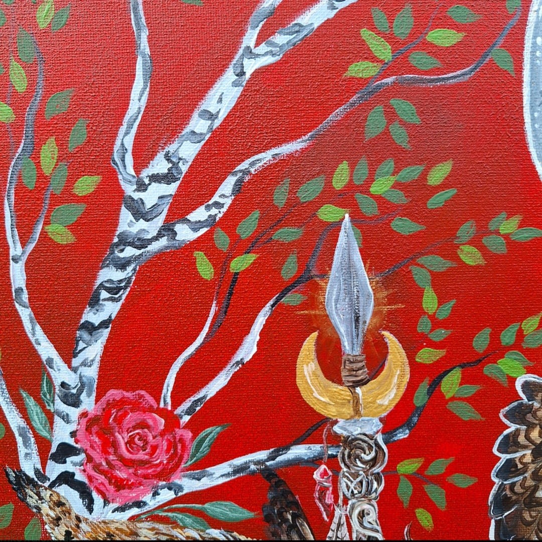 - wegetacja, płodność i miłość: brzoza z zielonymi liśćmi, jako jedno z pierwszych drzew wypuszczających pąki na wiosnę oraz czerwone róże;