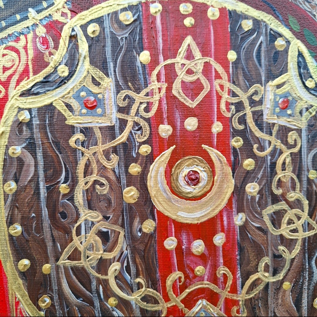 - magia: kryształy we włóczni i księżyc w pełni, złote sierpy księżyca;