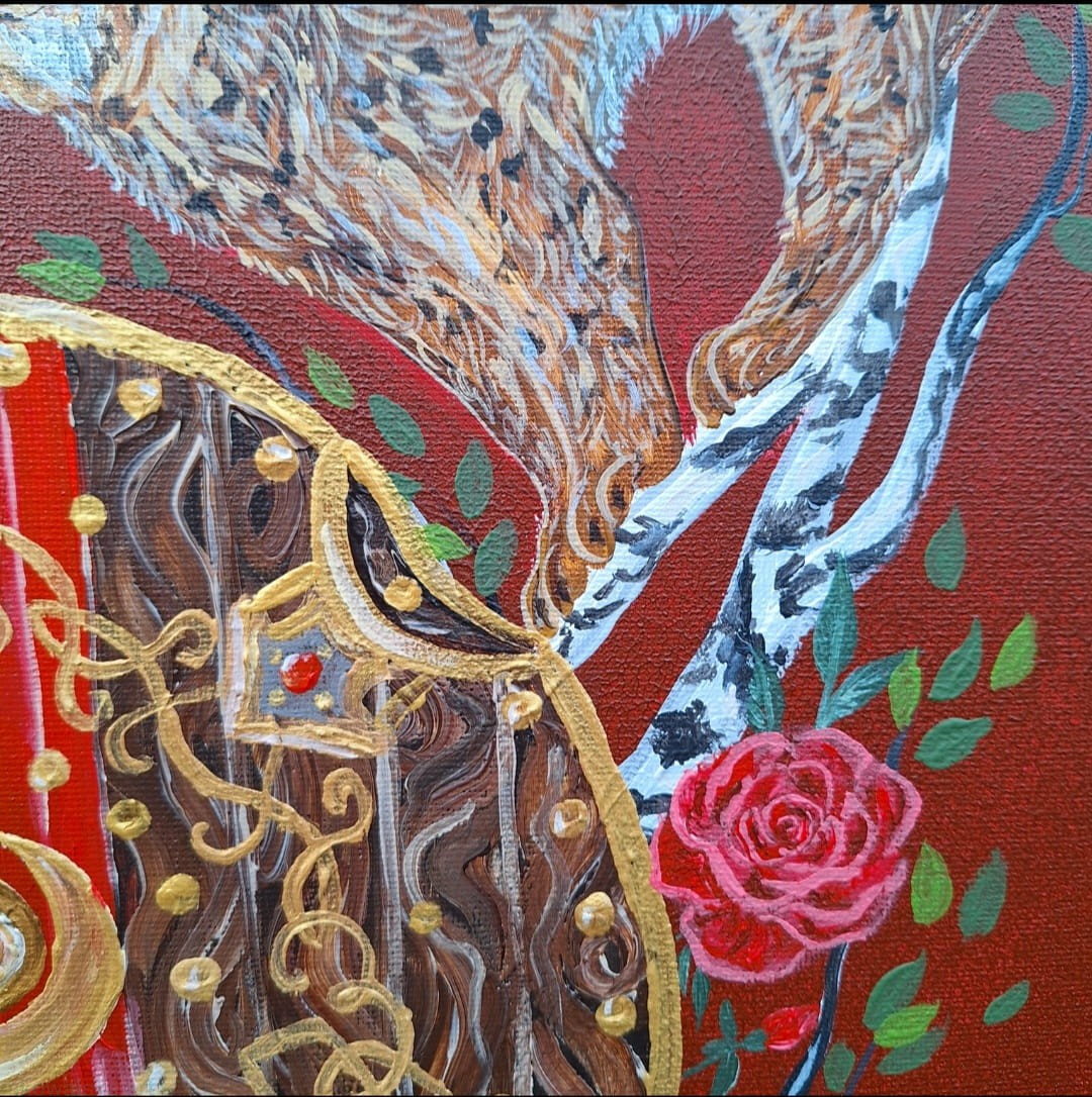 - połączenie miłości i wojny: czerwień na obrazie.