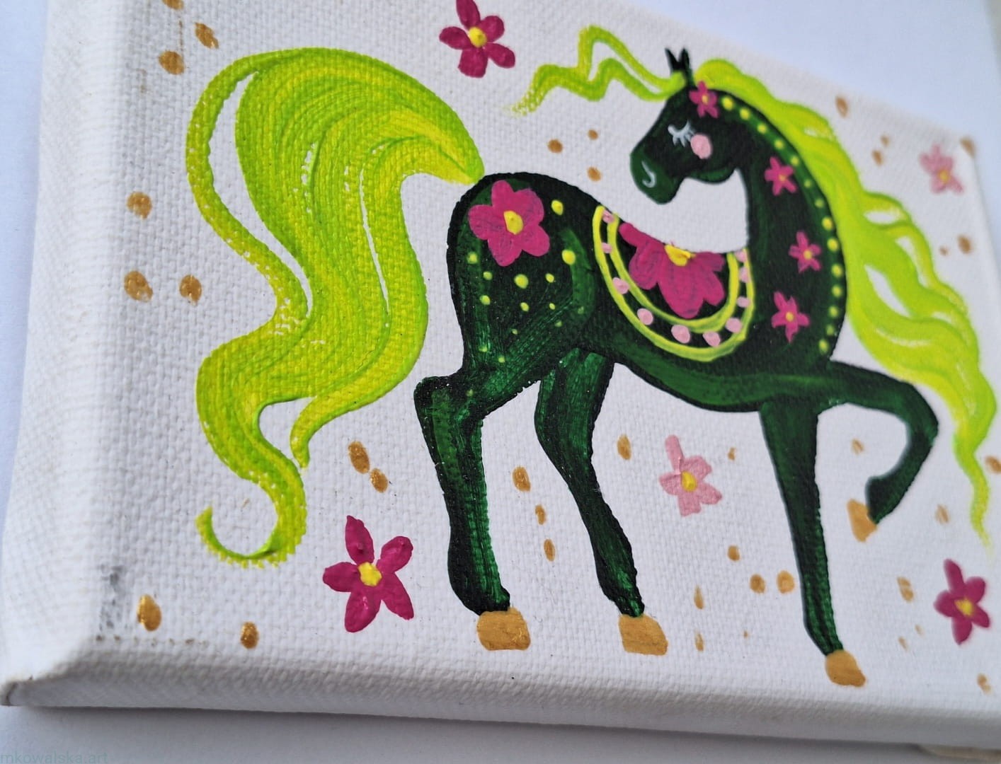 Obraz oryginalny Folkowy Konik Zielony lewy 15x10cm 2024