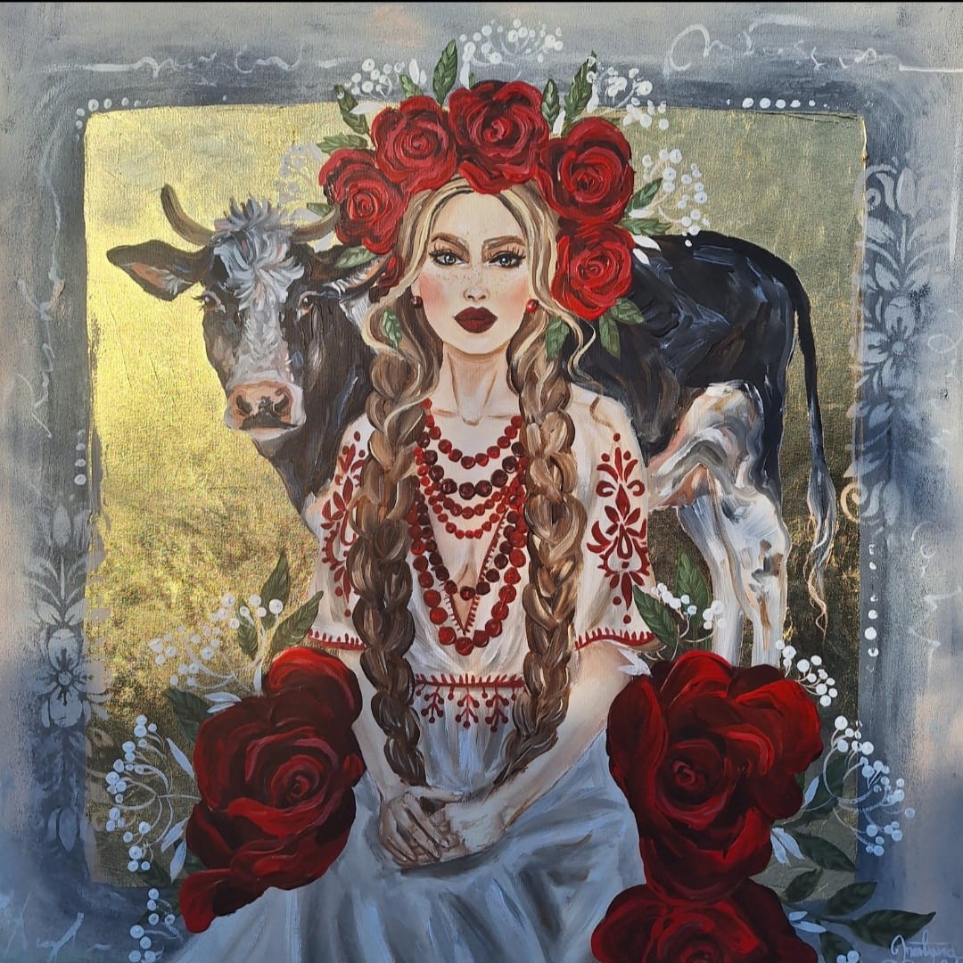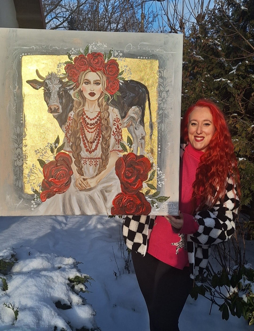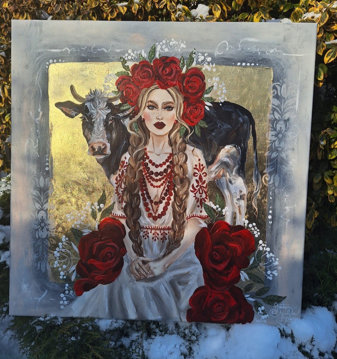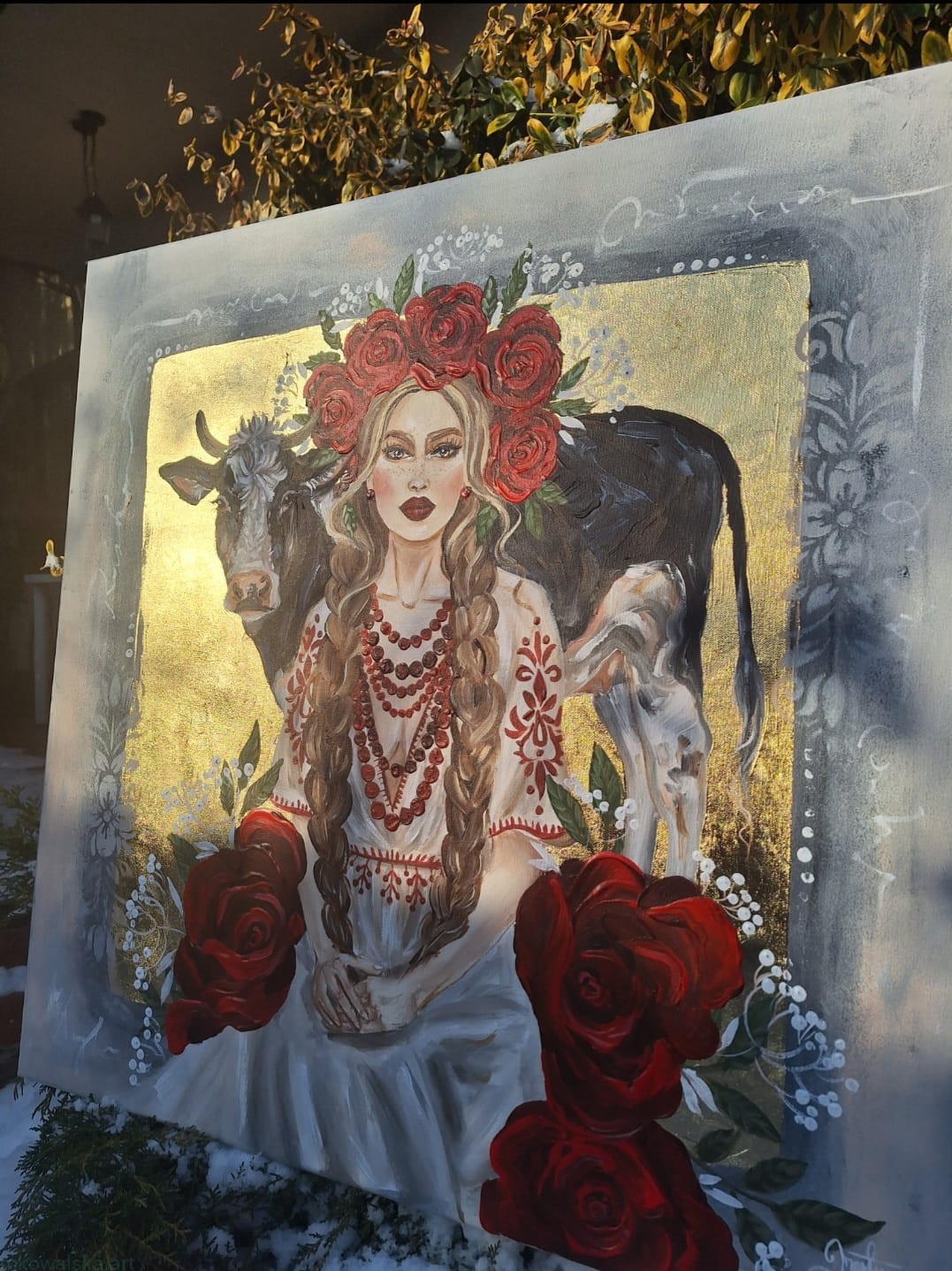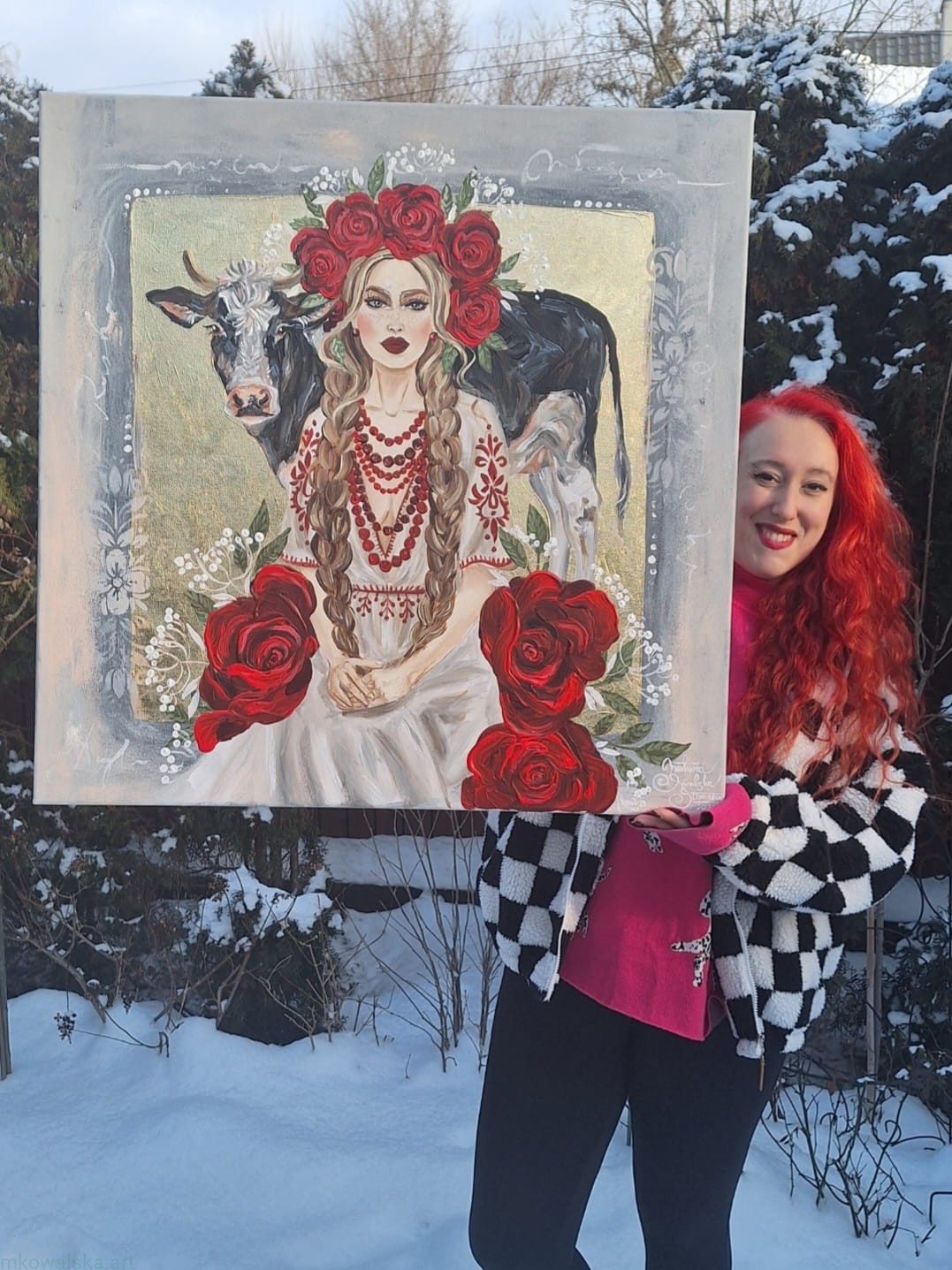 "MARYSIEŃKA" to kolejny obraz z serii Glamour Slavic Folk, która powstała w odpowiedzi na fakt mojej fascynacji kulturą słowiańską/ludową oraz chęci nadania tej sztuce lekko nowoczesnego sznytu.