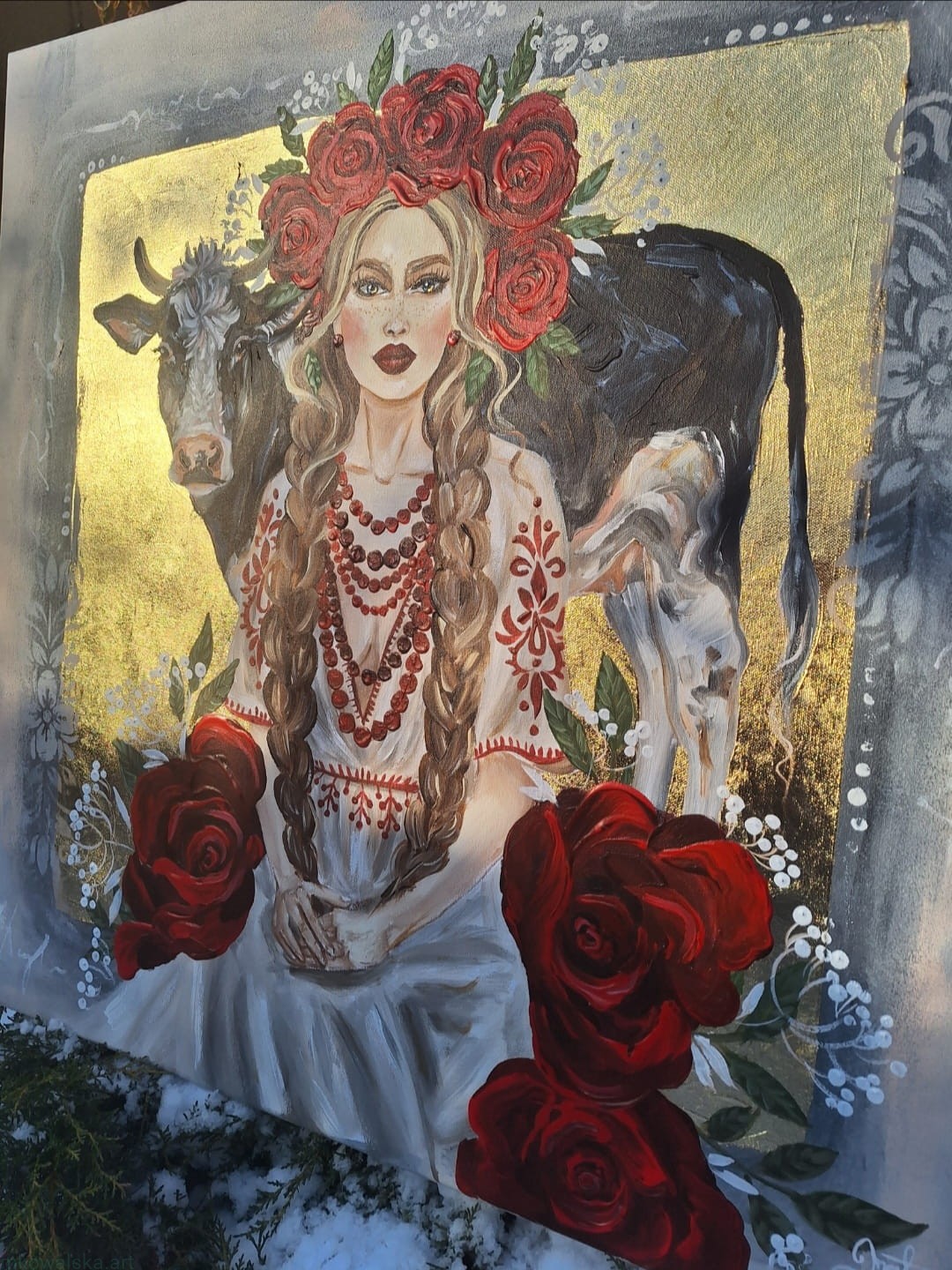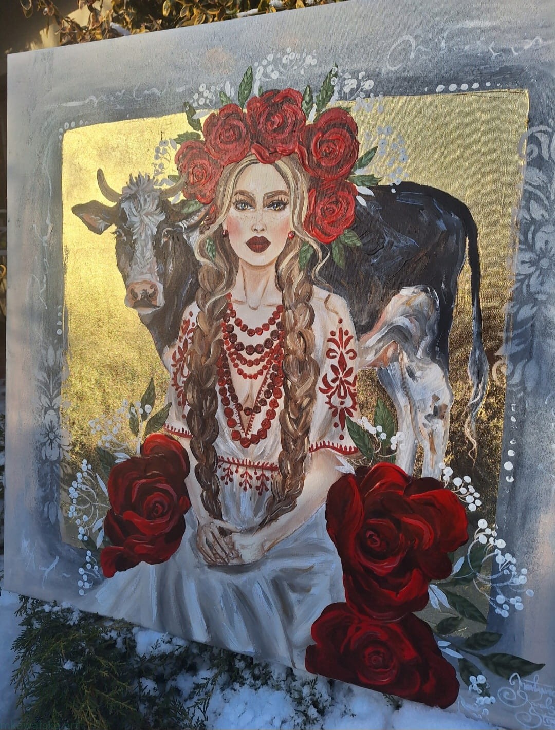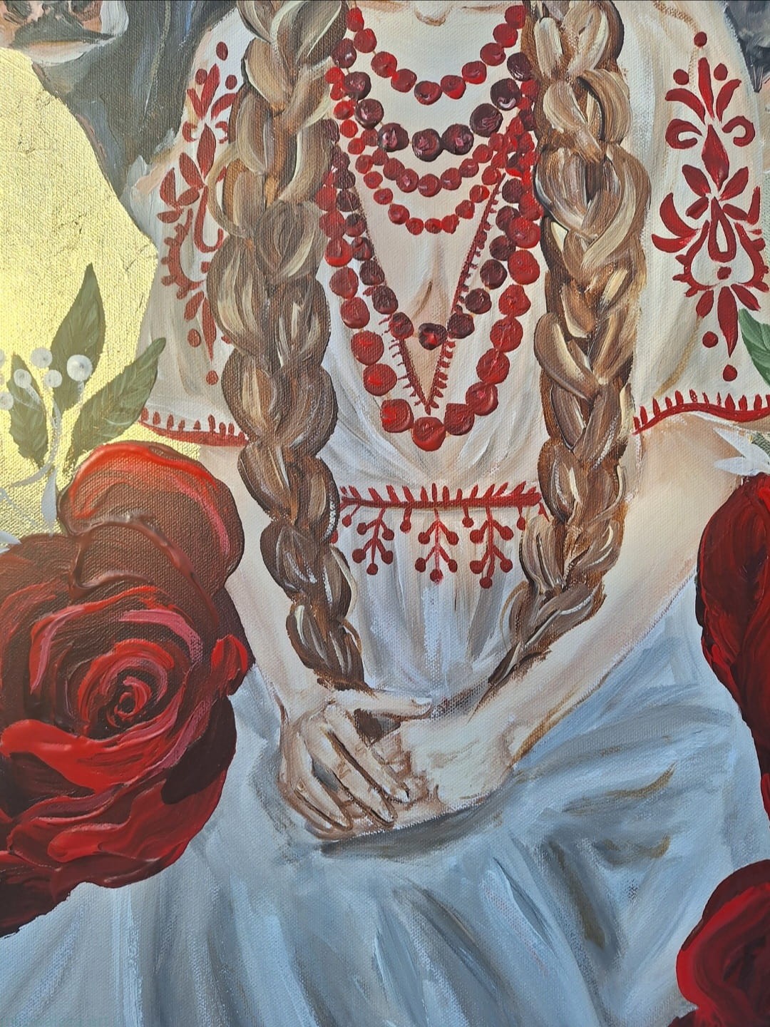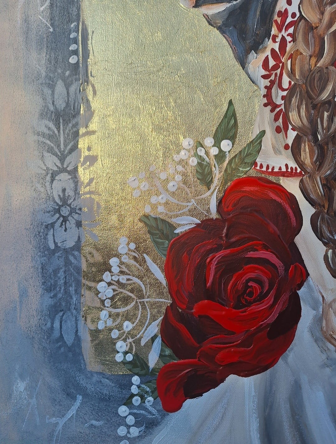 "MARYSIEŃKA" to kolejny obraz z serii Glamour Slavic Folk, która powstała w odpowiedzi na fakt mojej fascynacji kulturą słowiańską/ludową oraz chęci nadania tej sztuce lekko nowoczesnego sznytu.