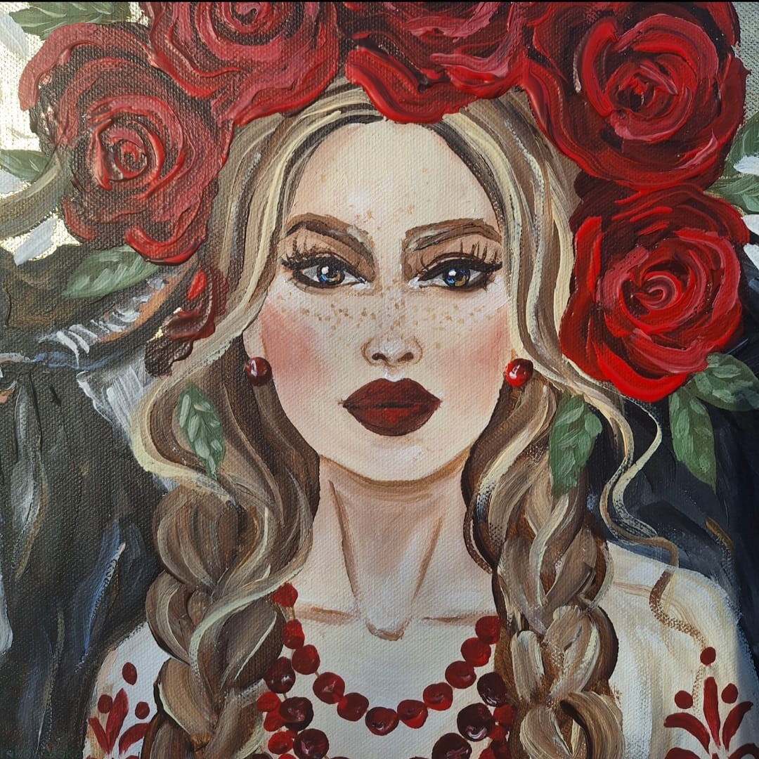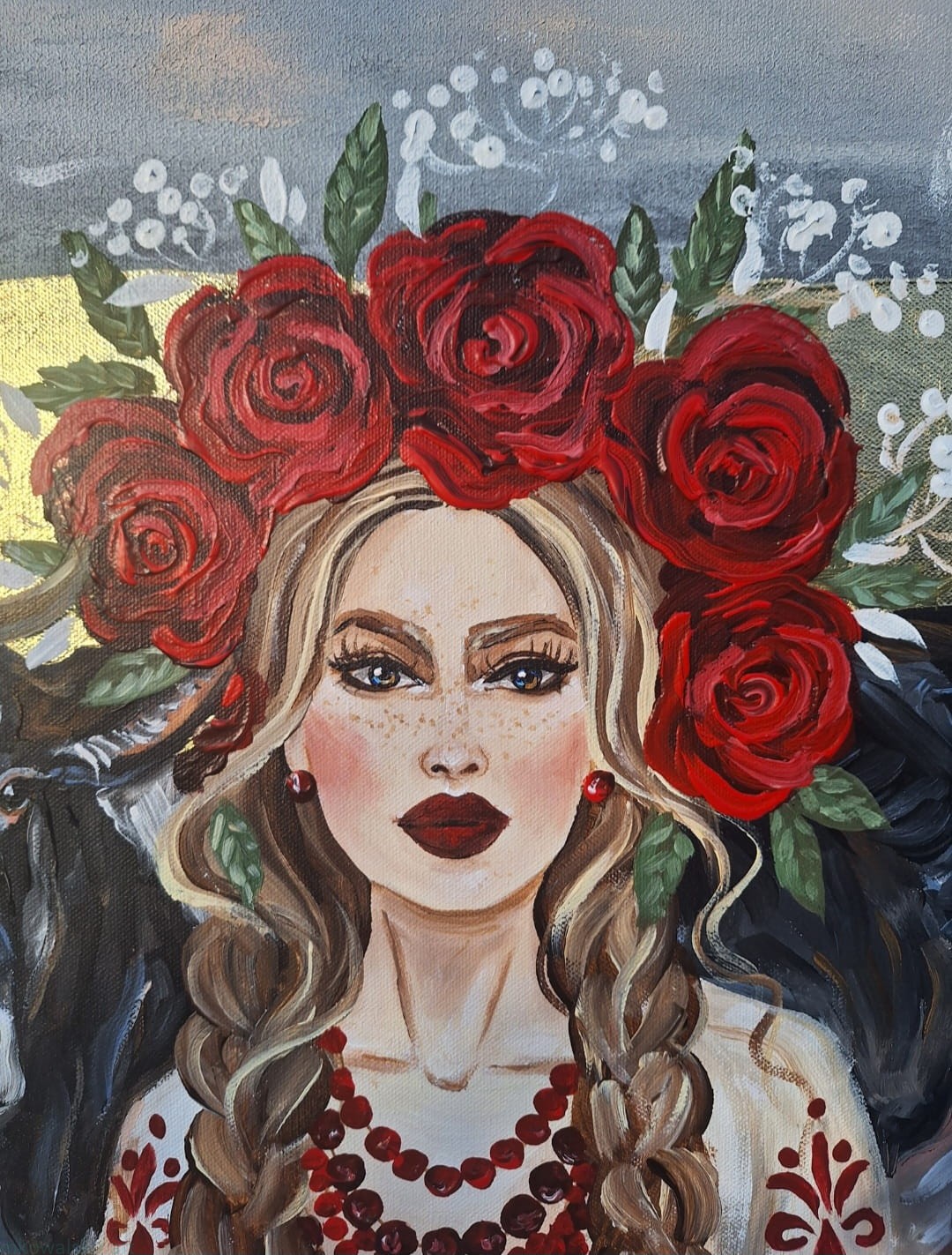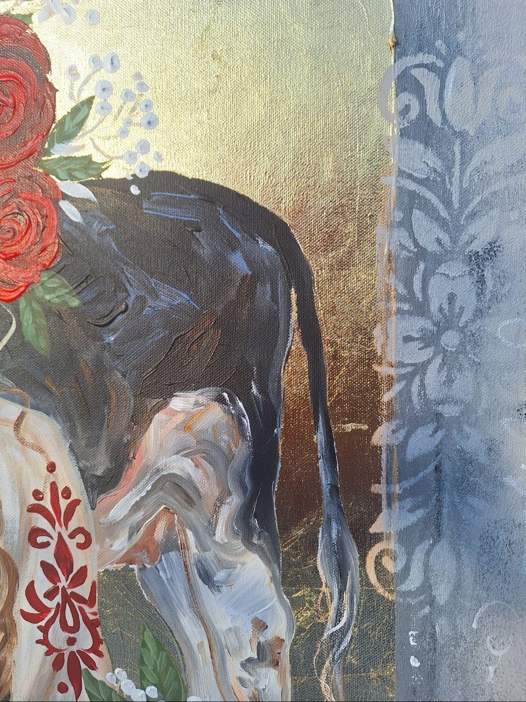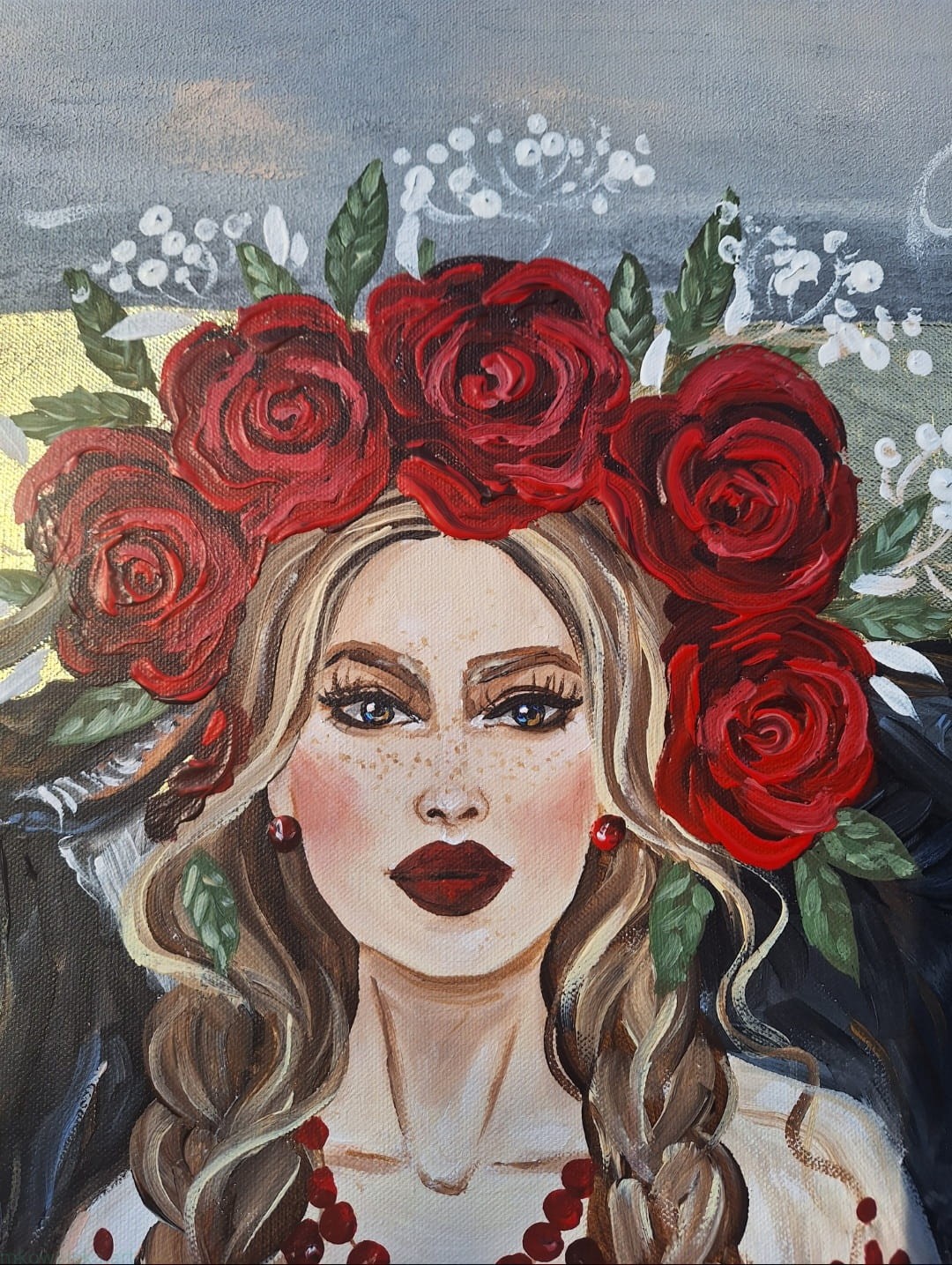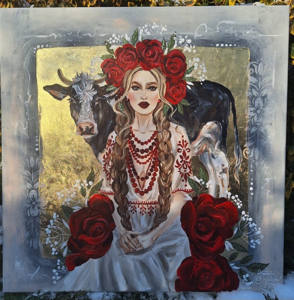 "MARYSIEŃKA" to kolejny obraz z serii Glamour Slavic Folk, która powstała w odpowiedzi na fakt mojej fascynacji kulturą słowiańską/ludową oraz chęci nadania tej sztuce lekko nowoczesnego sznytu.