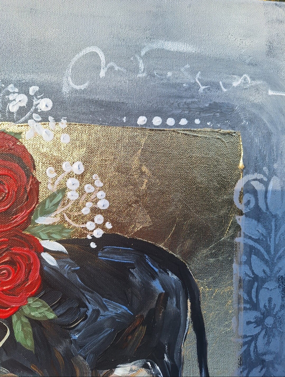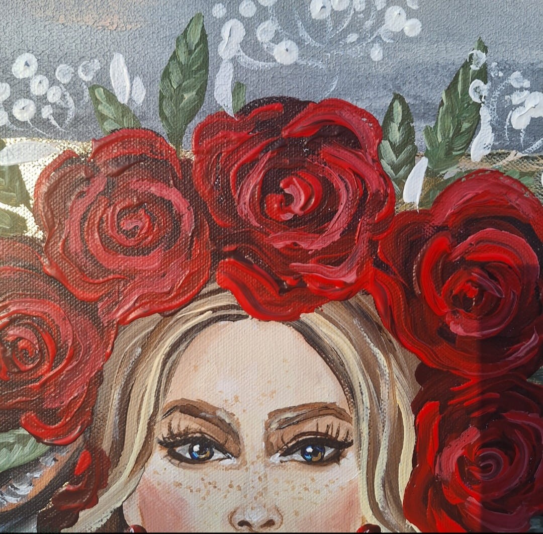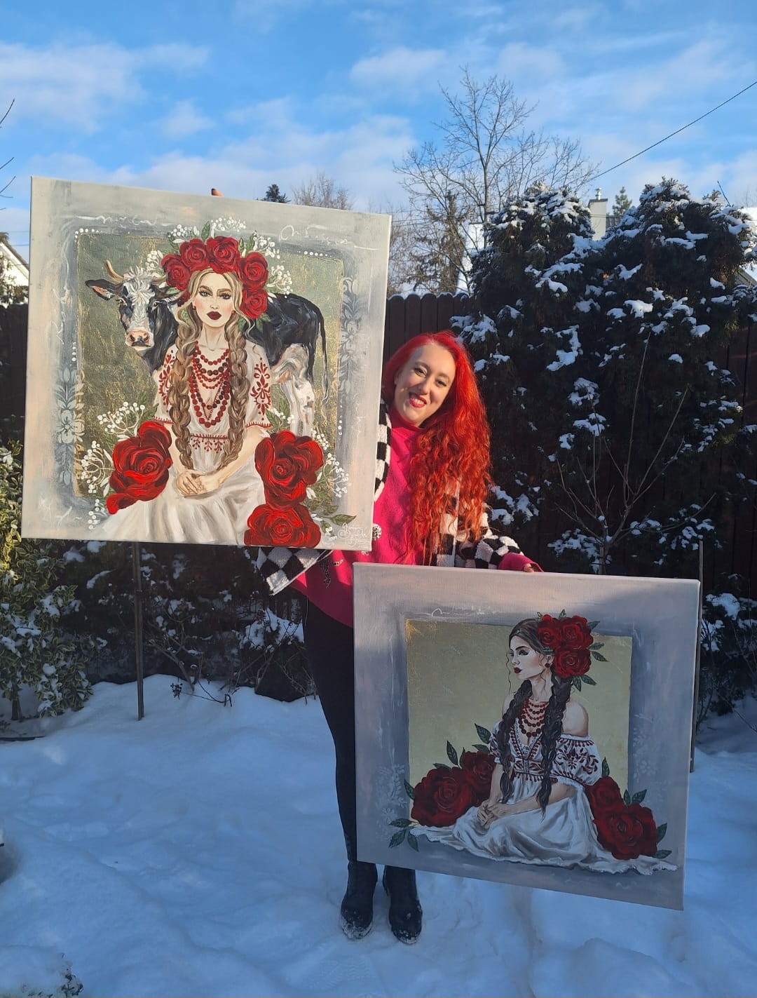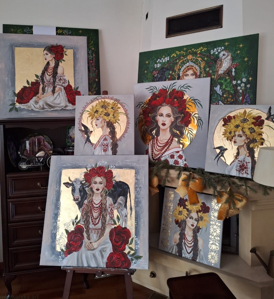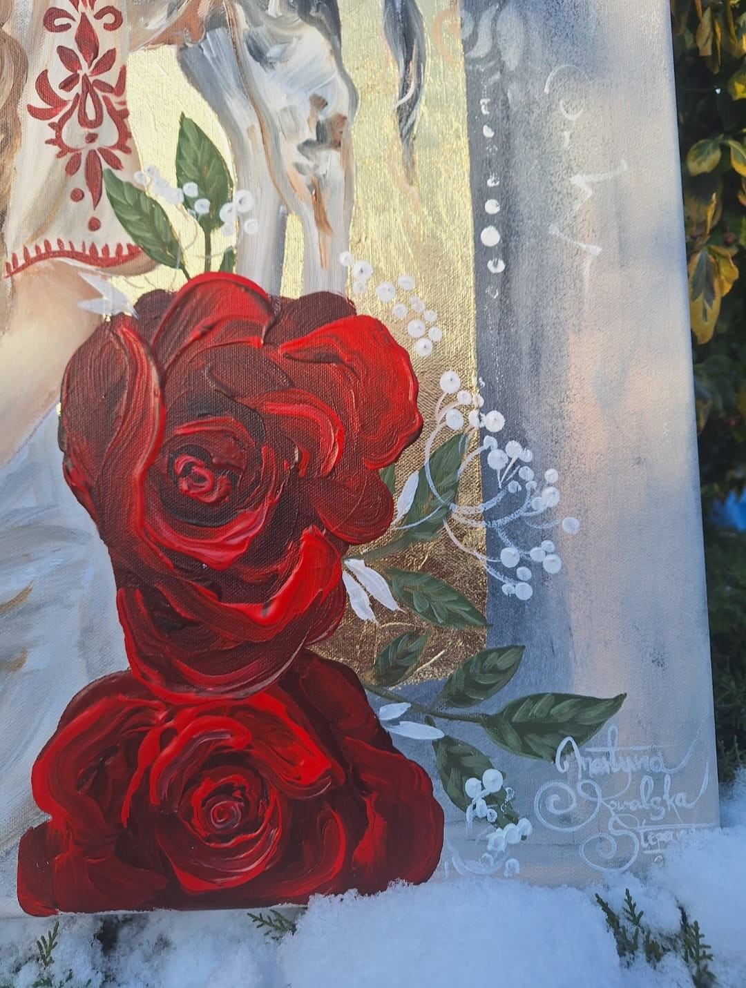 "MARYSIEŃKA" to kolejny obraz z serii Glamour Slavic Folk, która powstała w odpowiedzi na fakt mojej fascynacji kulturą słowiańską/ludową oraz chęci nadania tej sztuce lekko nowoczesnego sznytu.