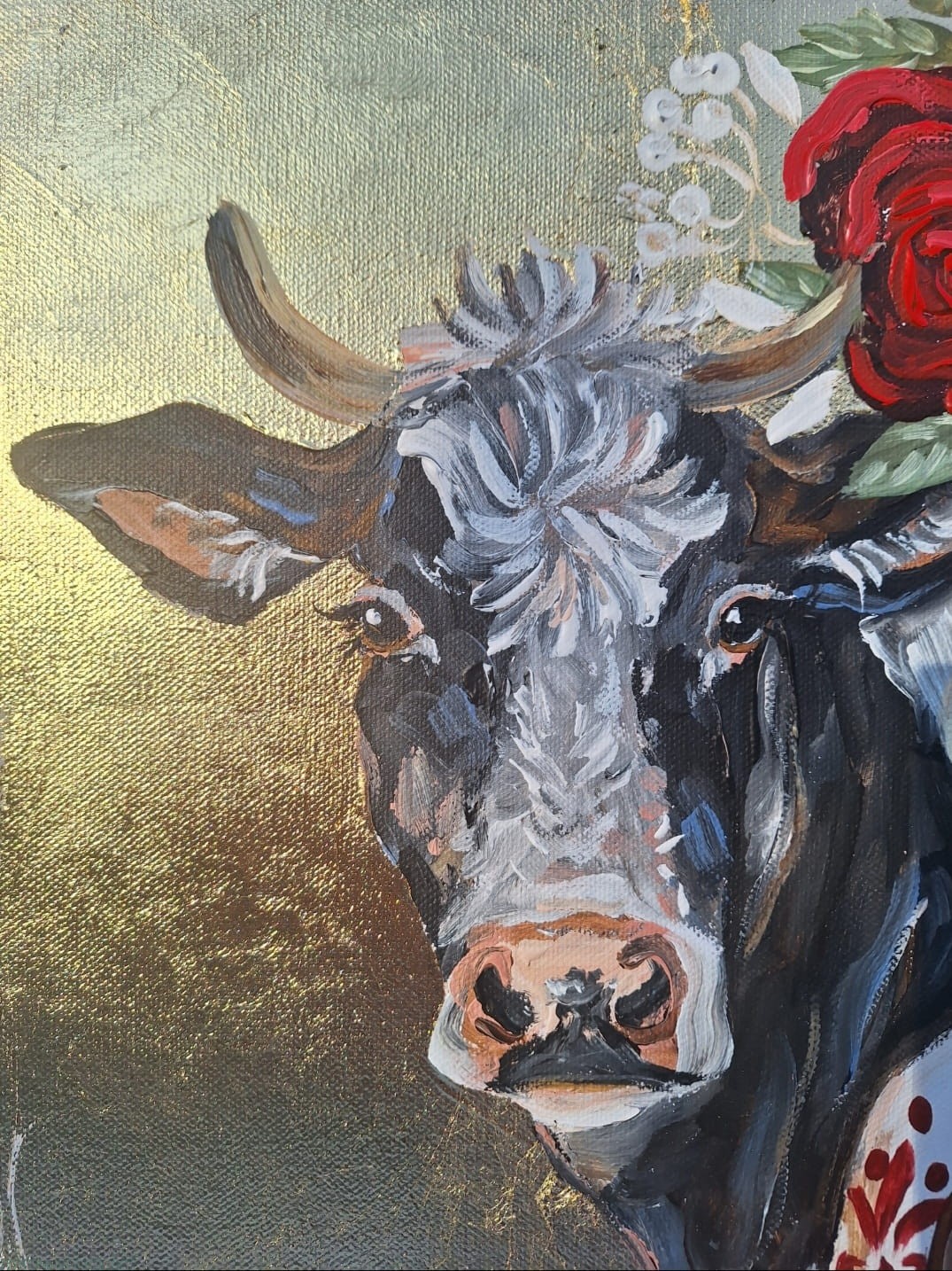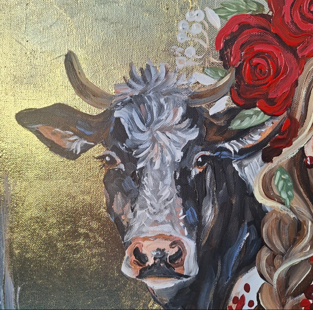 Marysieńka i krowa zostały zamknięte w kdwaratową ramę szlagmetalu (cienkie pozłacane płatki, przyklejane specjalnym klejem do płótna). Dzięki nim, obraz złoci się w promieniach słońca i światła sztucznego, uwypukla pierwszy (Marysieńka) i drugi (krowa) plan, ociepla szarość z tła. Dodaje posmaku glamour, bogactwa.