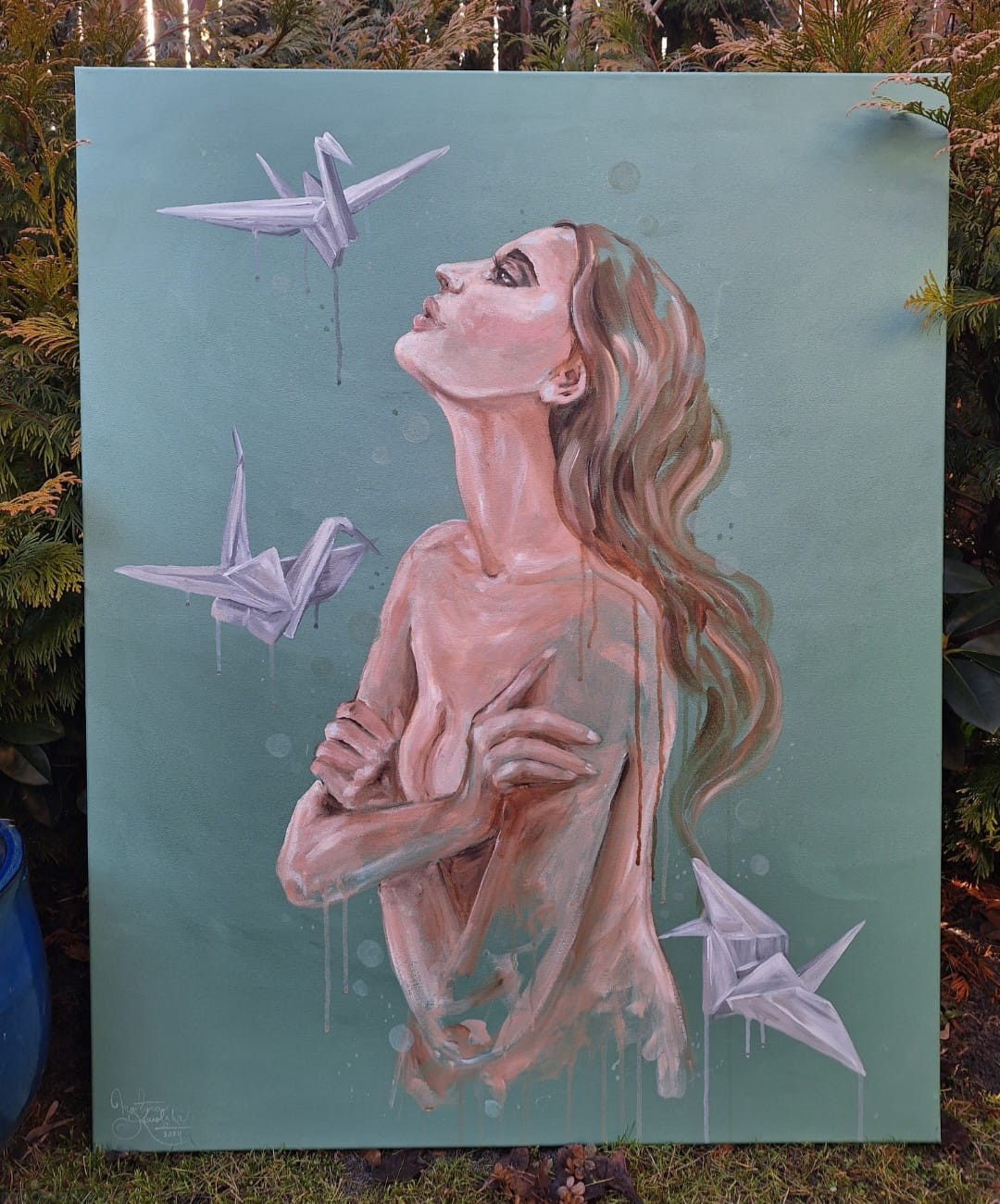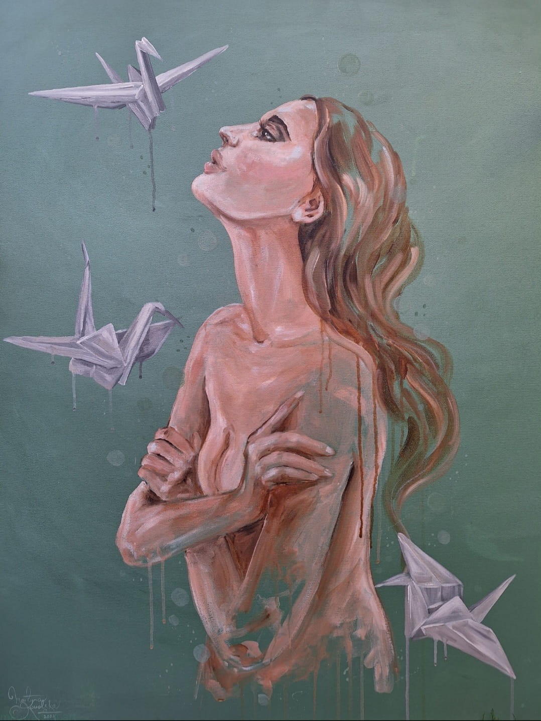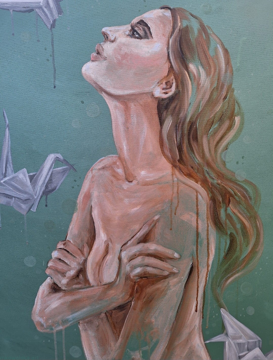 Symbolikę niewypowiedzianych słów odgrywają na tym obrazie żurawie origami. Sztuka origami, to tworzenie przedstawień (przede wszystkim zwierząt) z kartek papieru. U mnie ten papier jest właśnie pusty - niezapisany, niewypowiedziany.