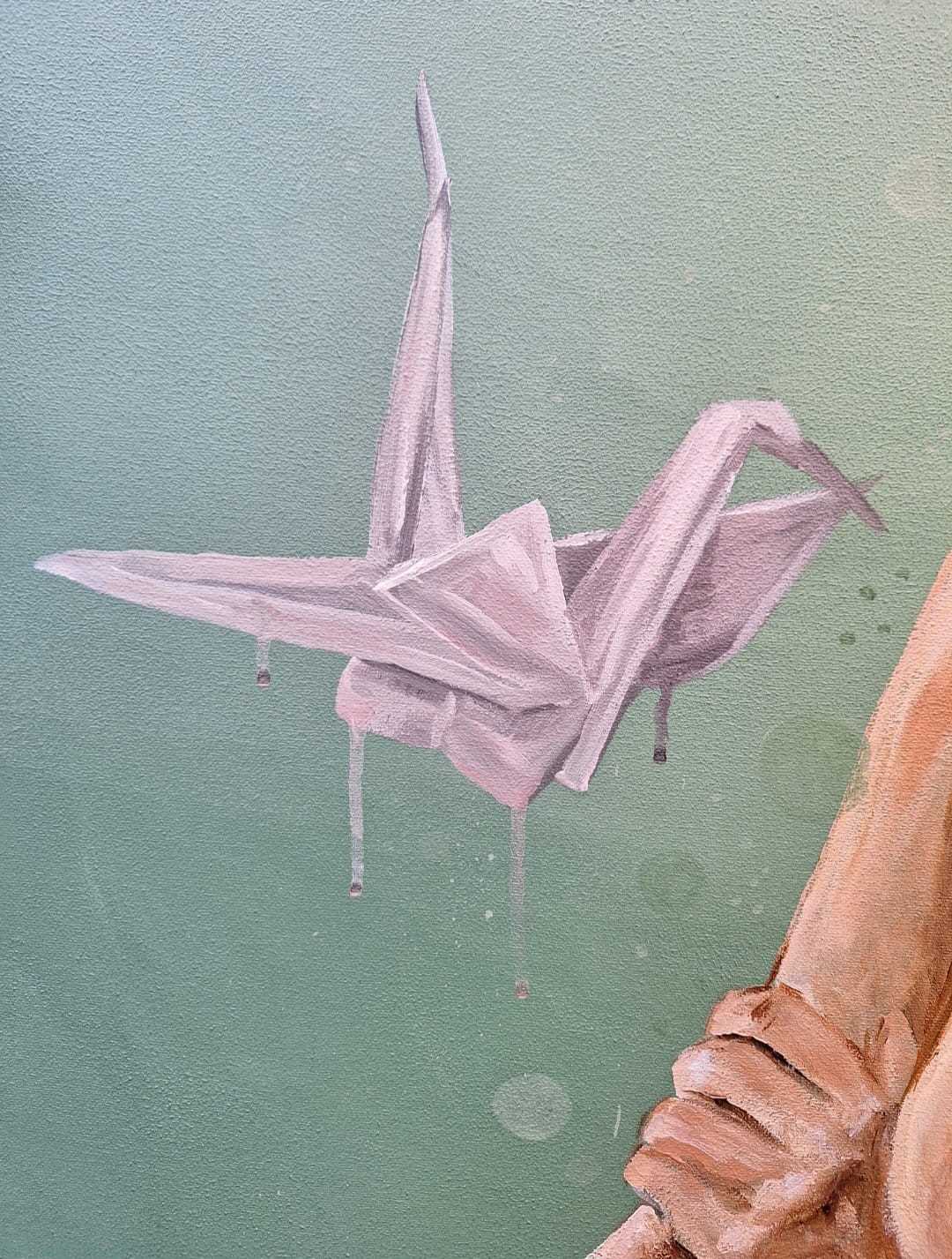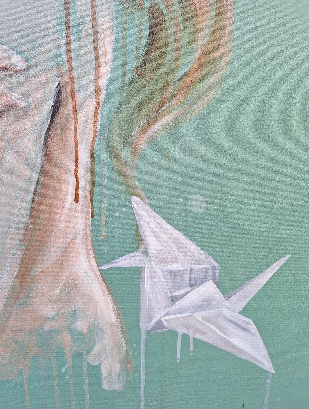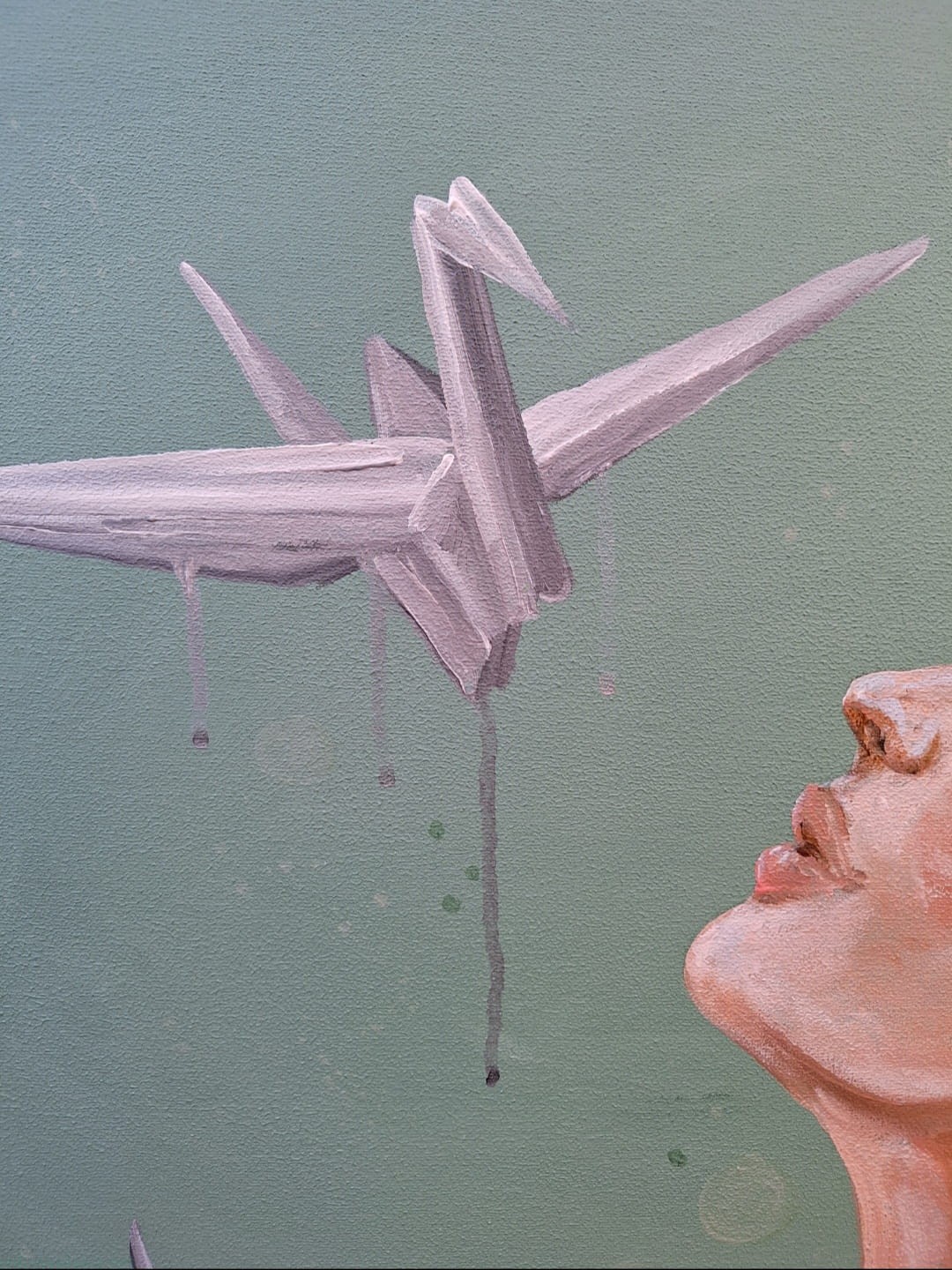 Symbolikę niewypowiedzianych słów odgrywają na tym obrazie żurawie origami. Sztuka origami, to tworzenie przedstawień (przede wszystkim zwierząt) z kartek papieru. U mnie ten papier jest właśnie pusty - niezapisany, niewypowiedziany.