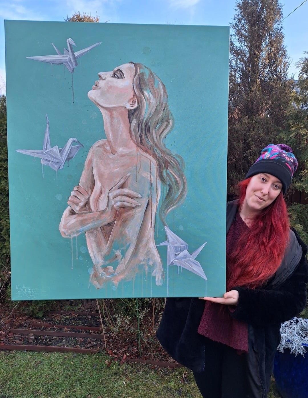 Obraz oryginalny, format 100x80cm (wysokość x szerokość), farby akrylowe na płótnie bawełnianym obitym na drewnianą ramę.
