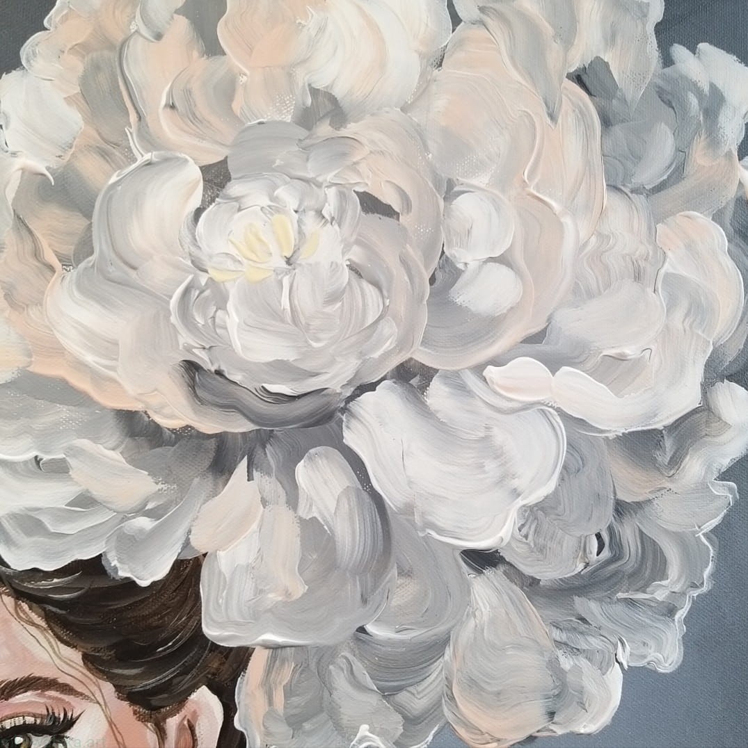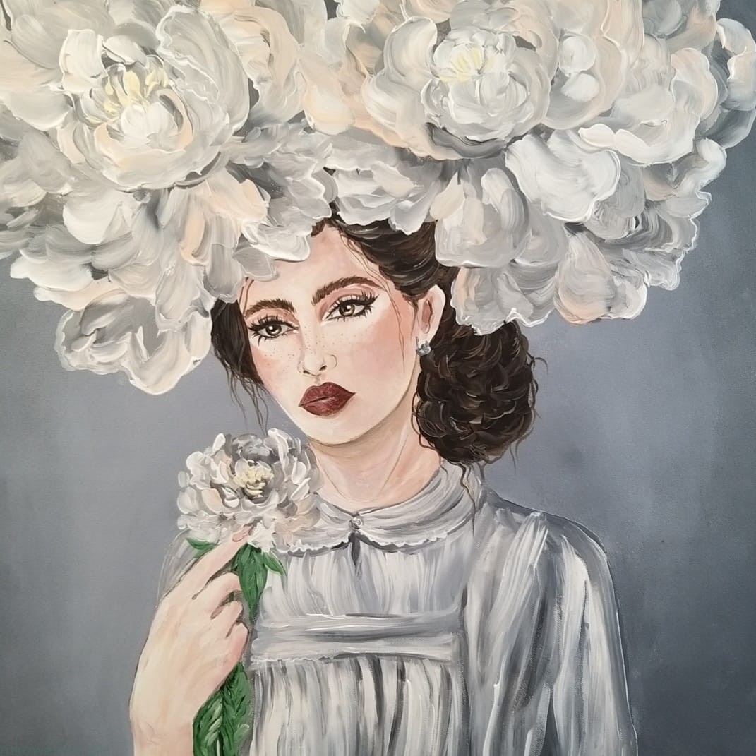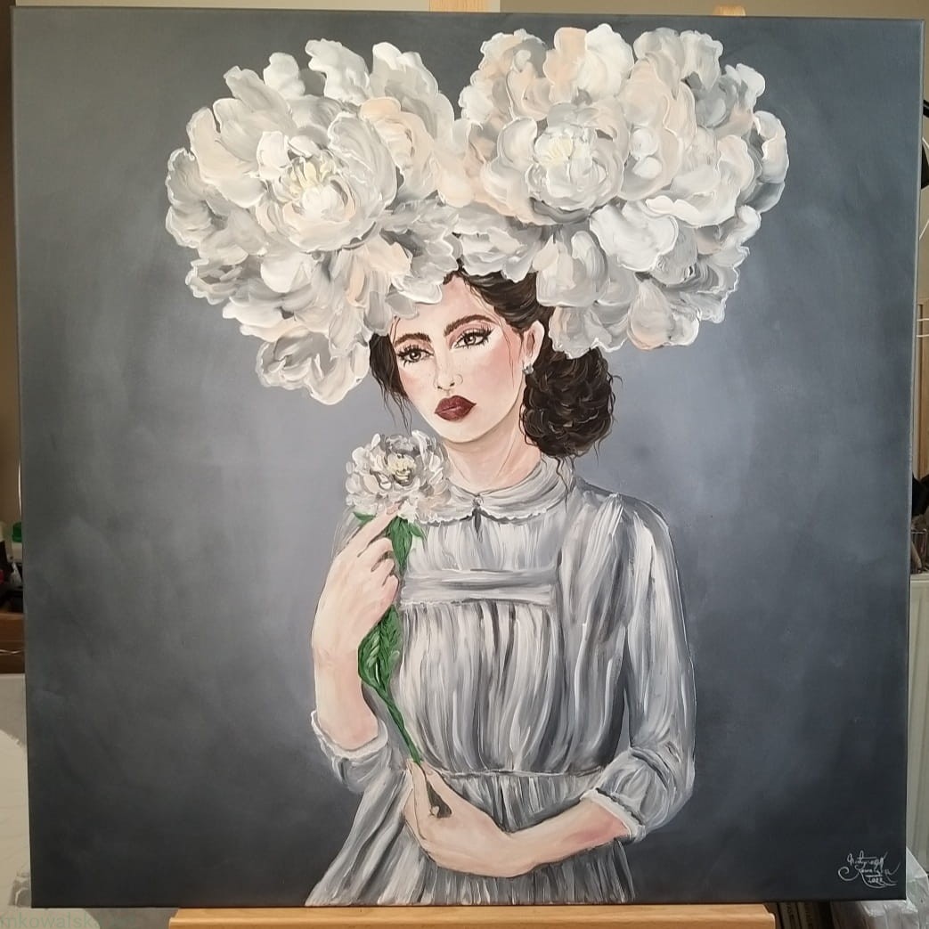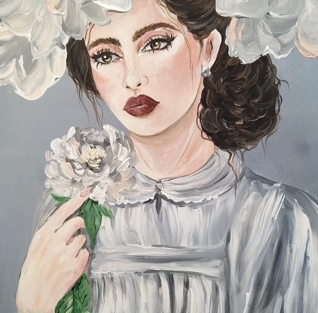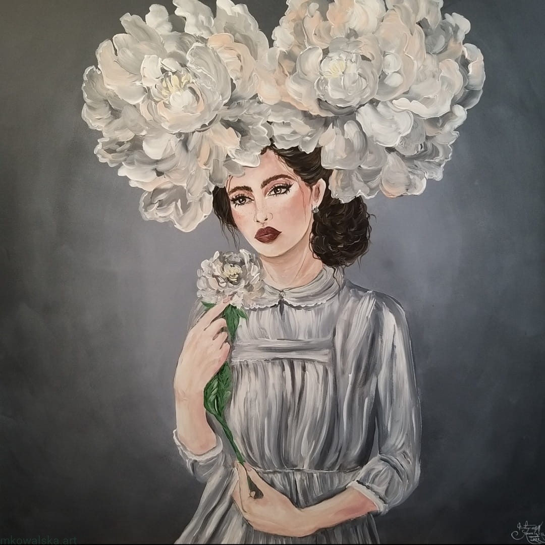 To bardzo delikatny i nostalgiczny obraz kobiety z dużymi kwiatami piwonii na głowie. Utrzymany w romantycznym stylu.