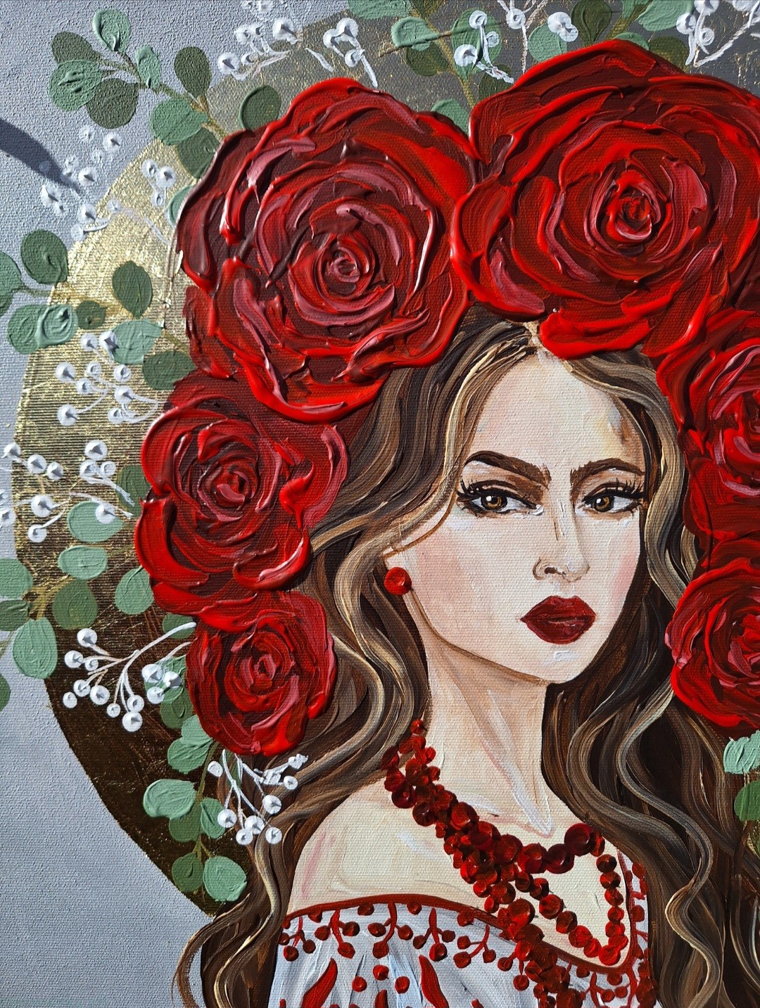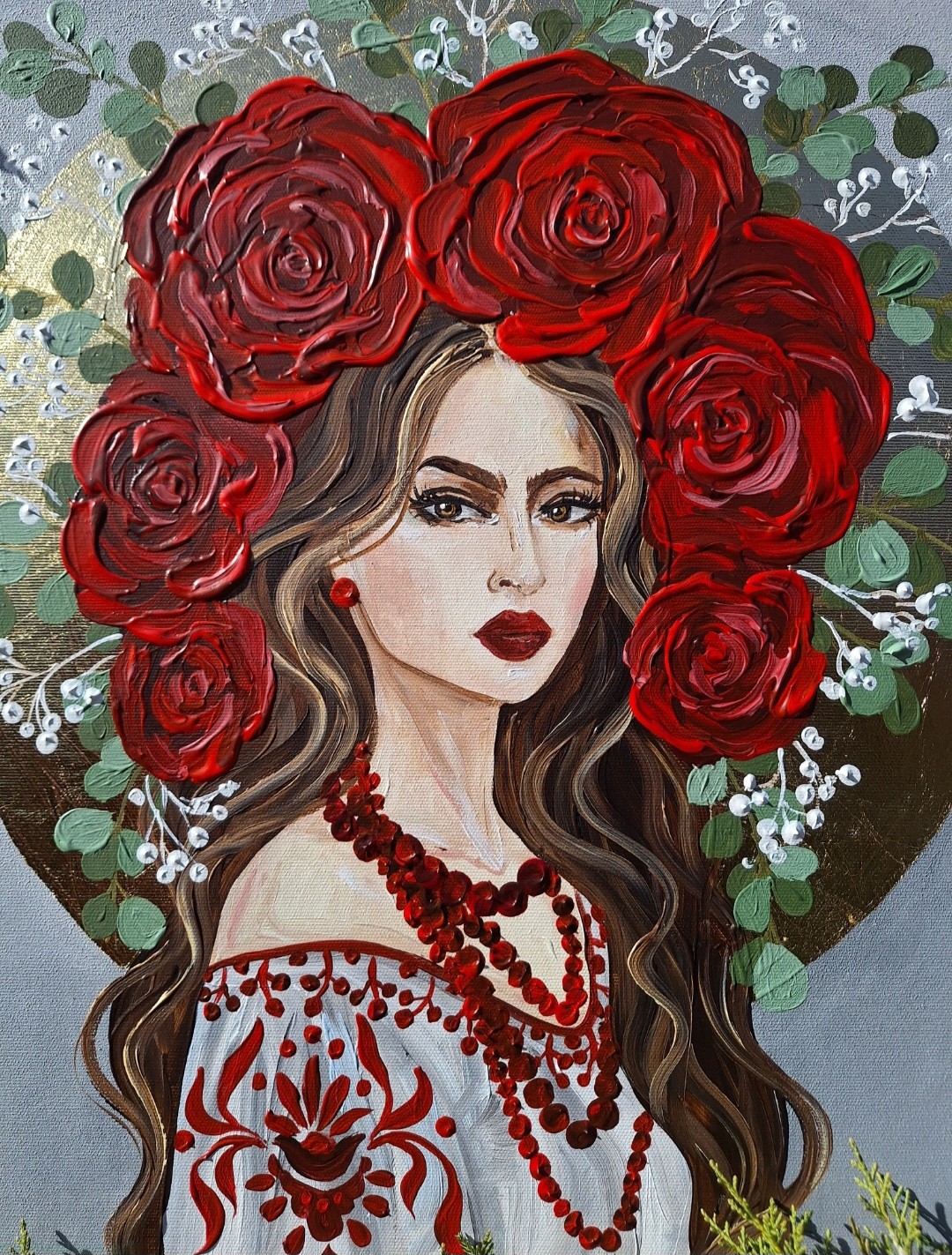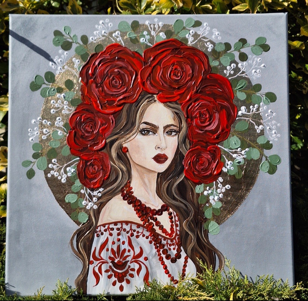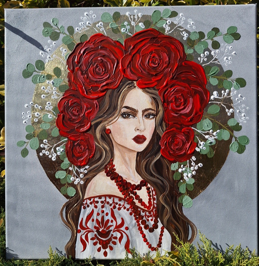 Siła we mnie - obraz z serii Glamour Slavic Folk, w której łączę inspiracje sztuką ludową (nurt w sztuce: prymitywizm), folklorem oraz zestawiam go z bogactwem złota.
