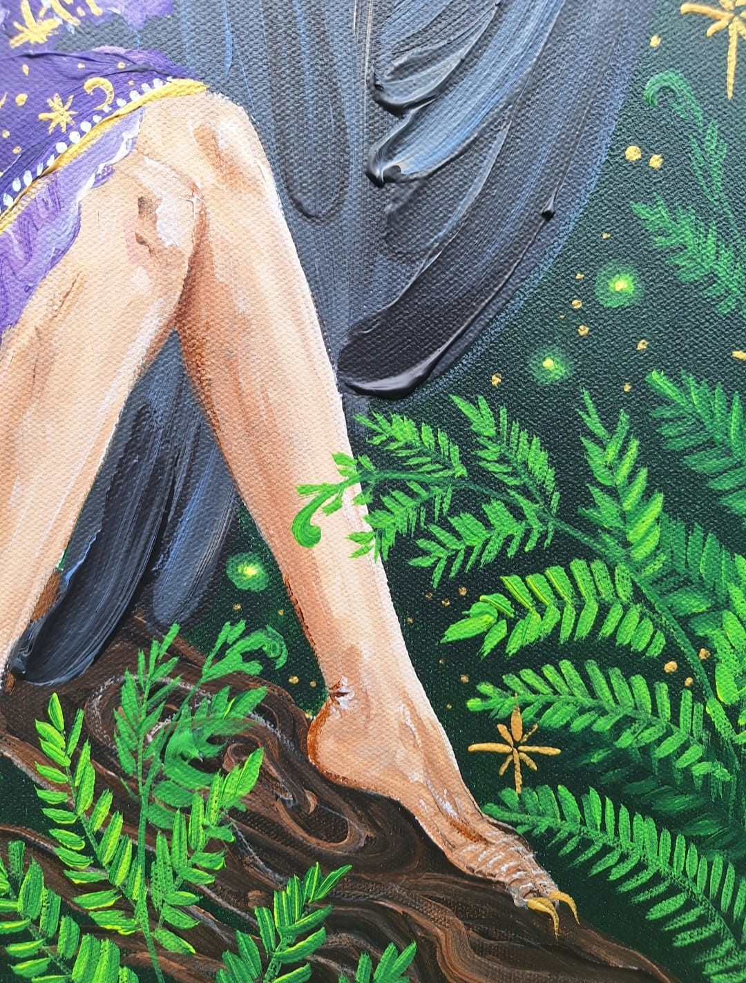 W mojej malarskiej interpretacji Sirin jest skrzydlatą kobietą, siedzącą na gałęzi drzewa. Elementami ptasimy jej sylwetki są skrzydła, długi szpony u rąk, jak też ptasie nogi. Zdecydowałam się na takie przedstawienie sirina, aby pogłębić jego symbolikę wpływania na naturę ludzką.