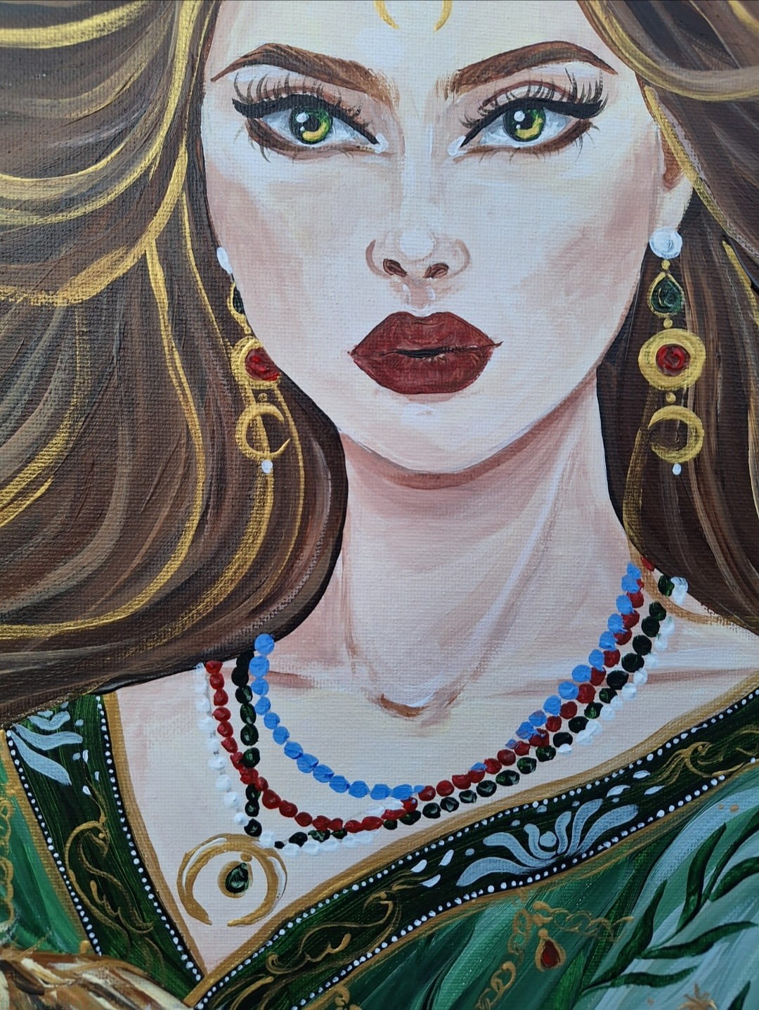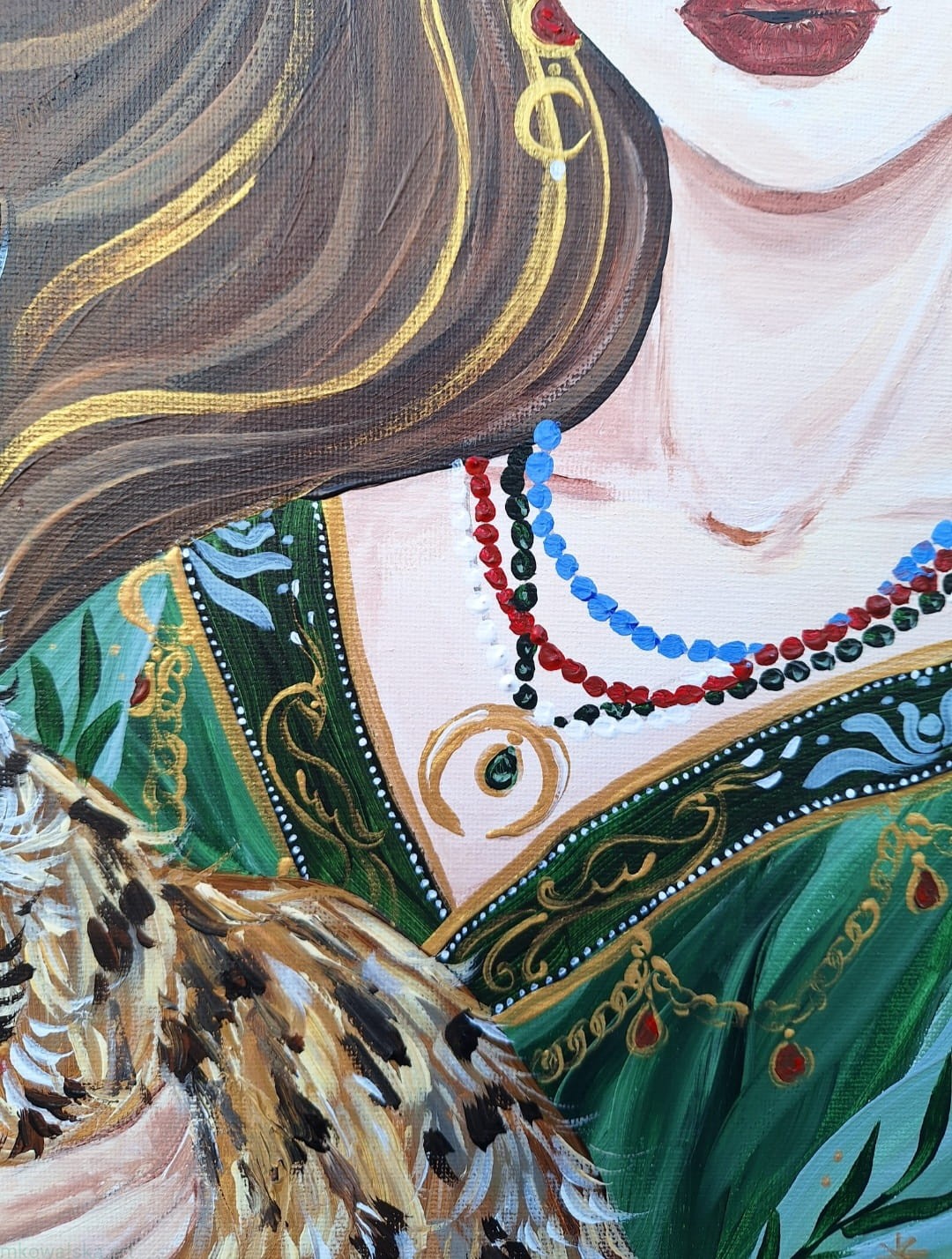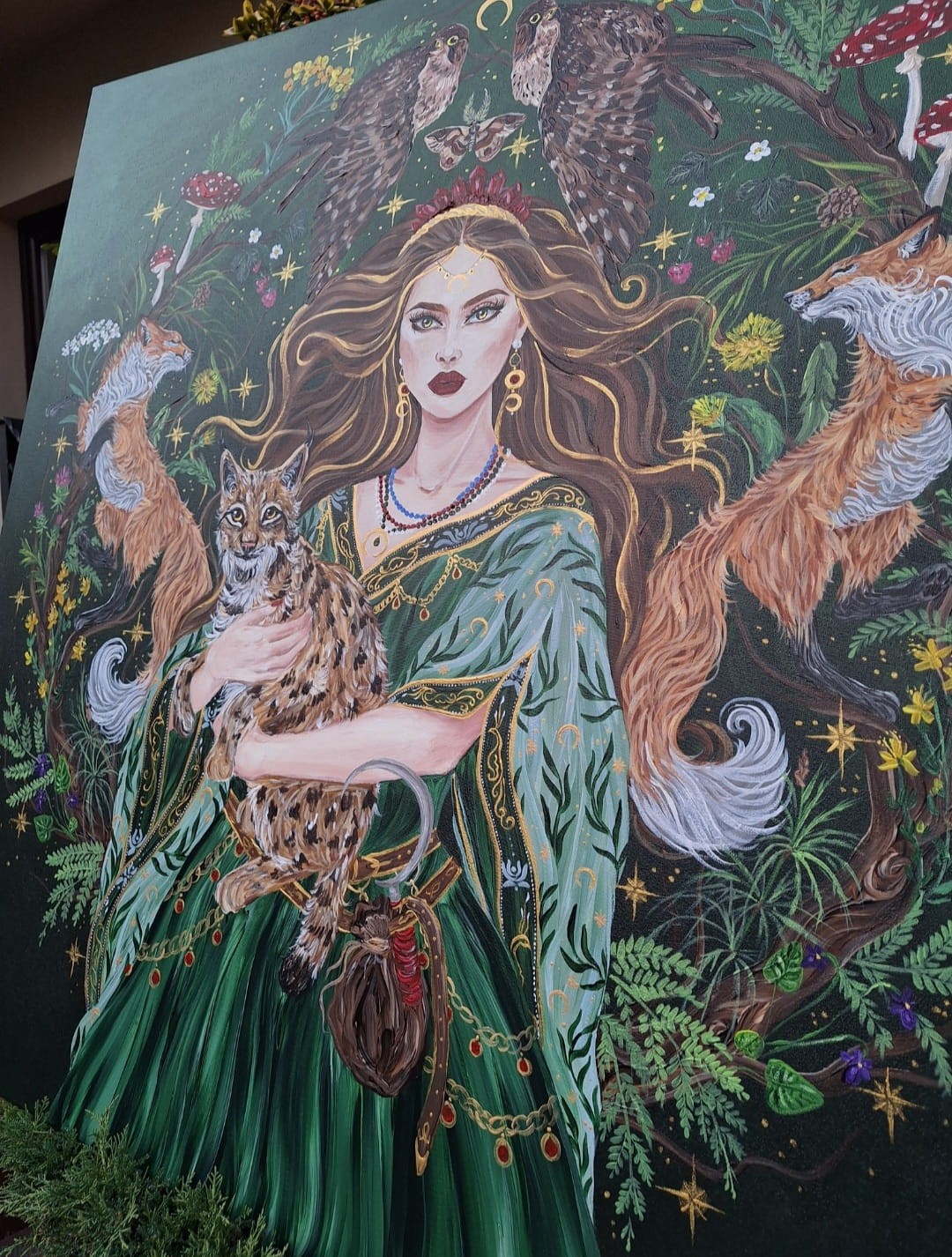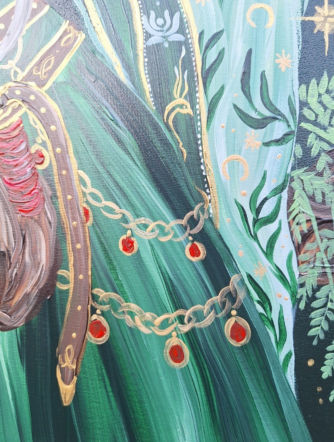 Obraz oryginalny przedstawiający moją malarską interpretację Zielarki, czyli kobiety wiedzącej, posiadającą ogromną wiedzę w zakresie zbioru, przetwórstwa i używania ziół oraz innych darów Matki Natury.