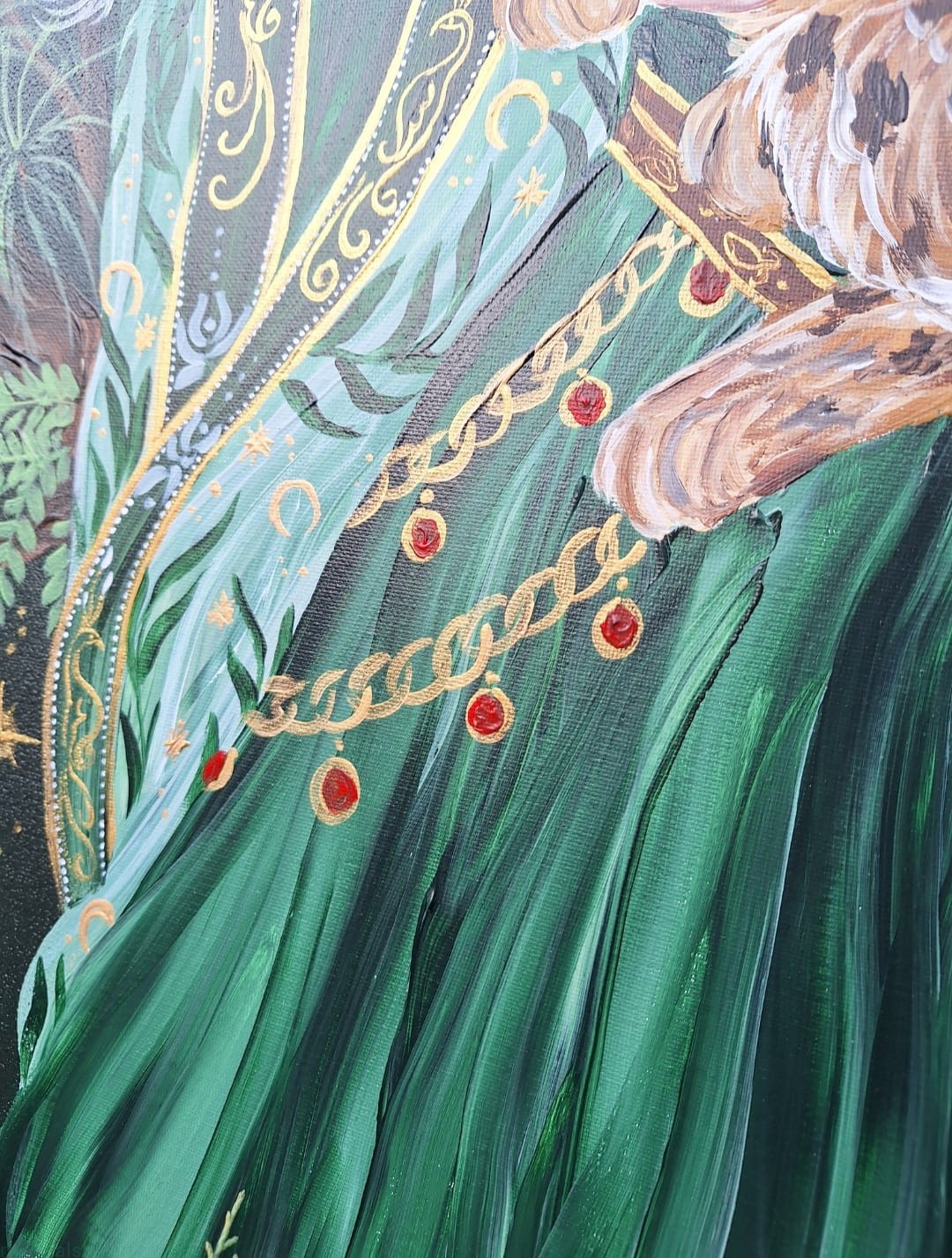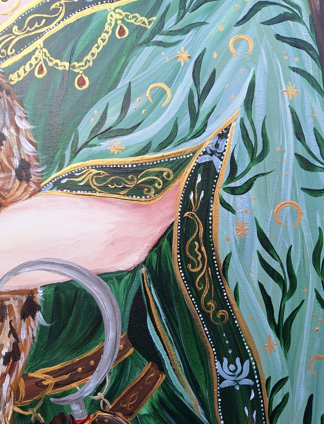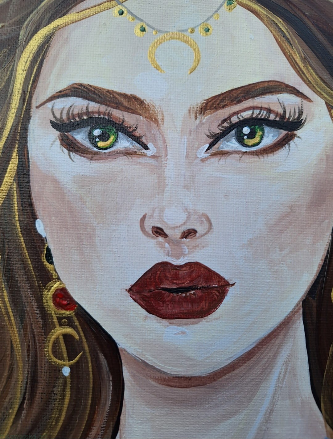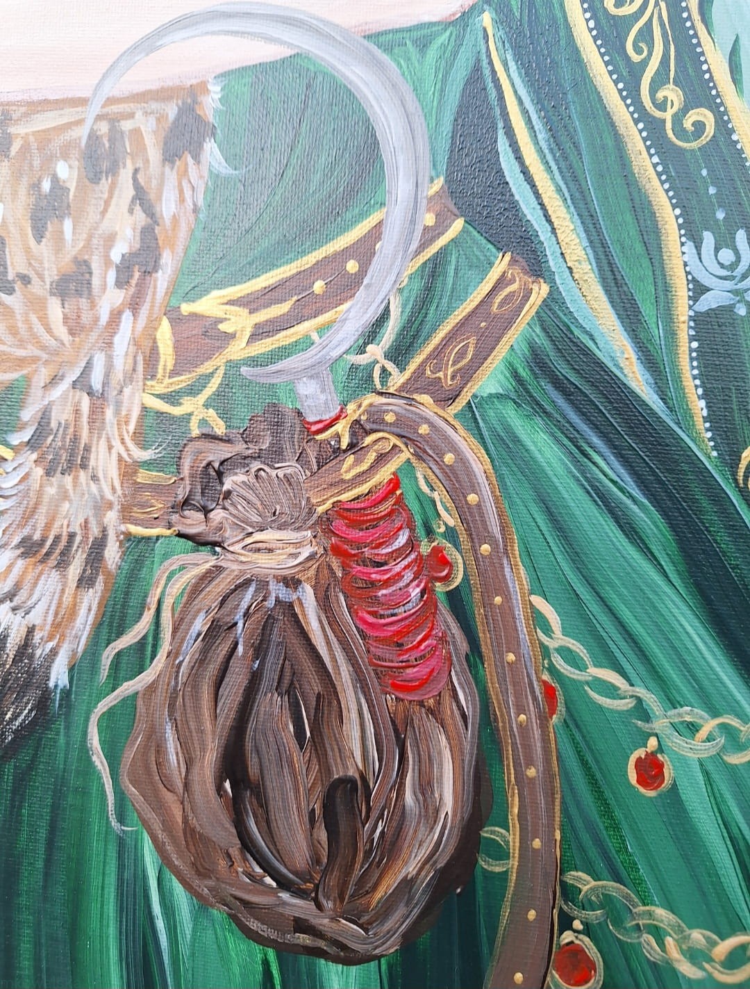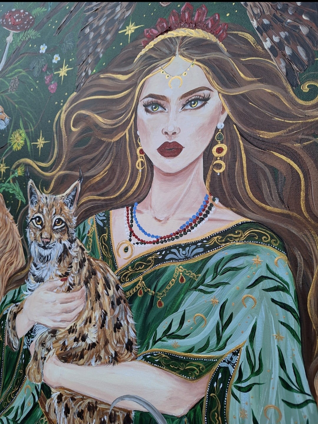 Obraz oryginalny przedstawiający moją malarską interpretację Zielarki, czyli kobiety wiedzącej, posiadającą ogromną wiedzę w zakresie zbioru, przetwórstwa i używania ziół oraz innych darów Matki Natury.