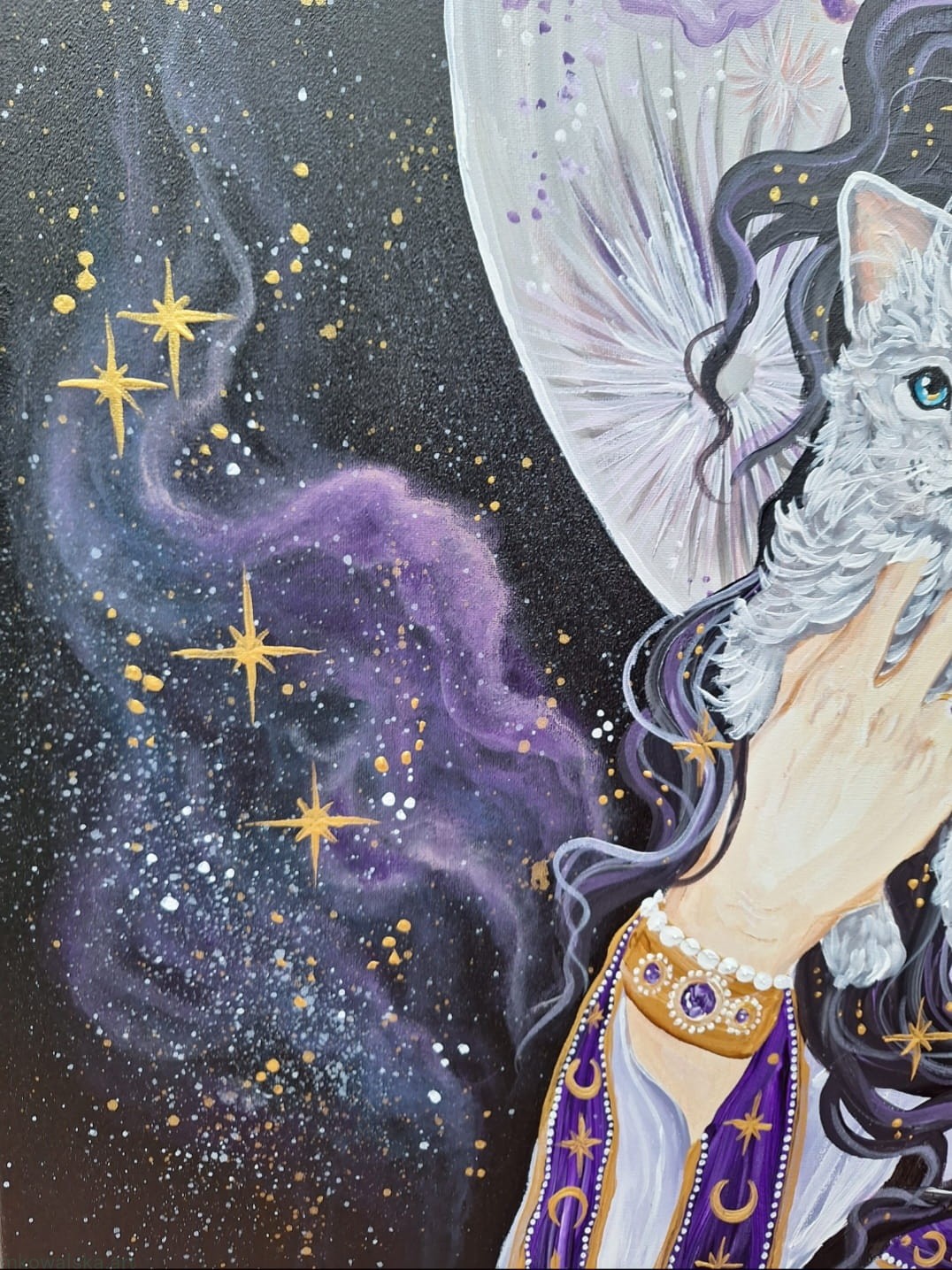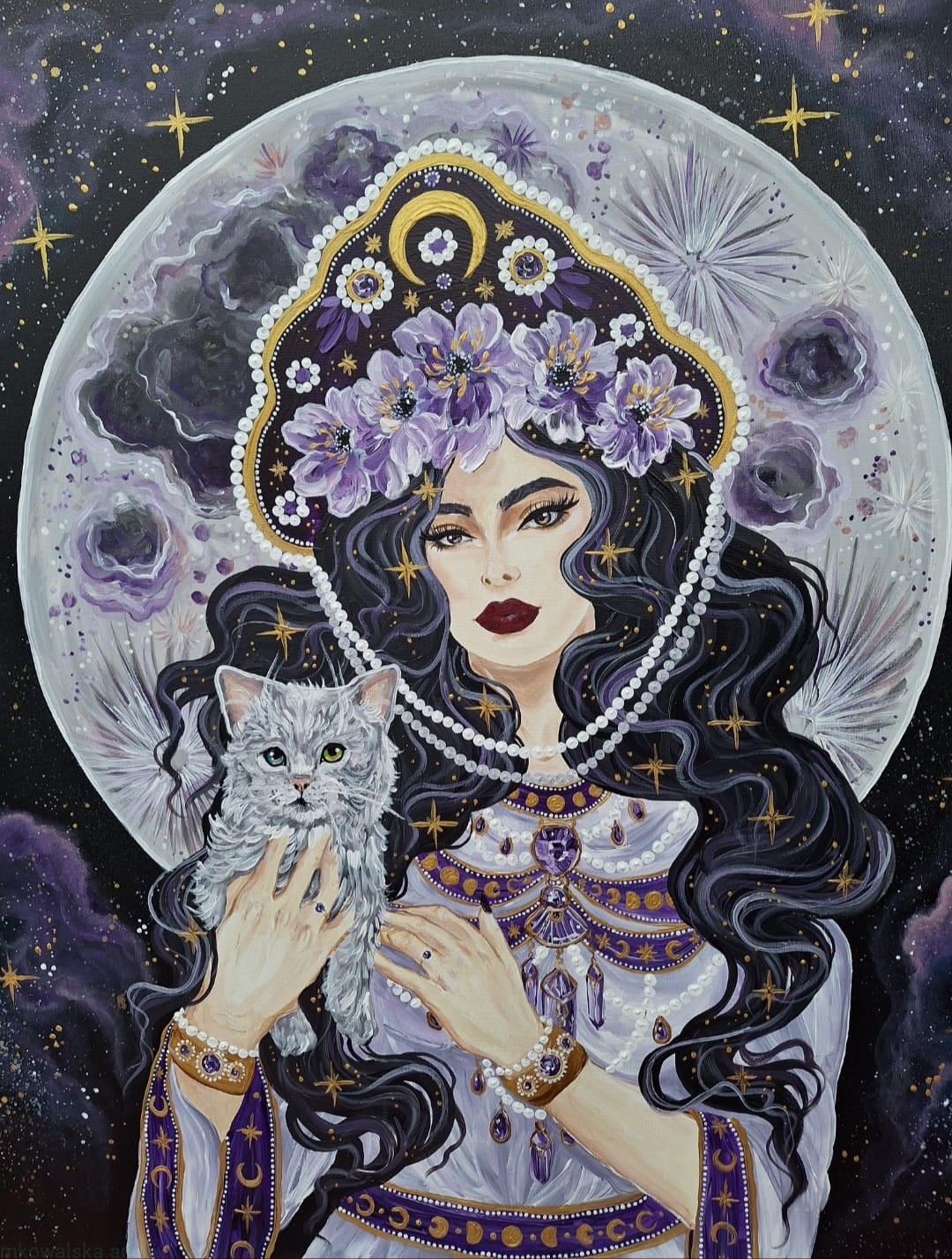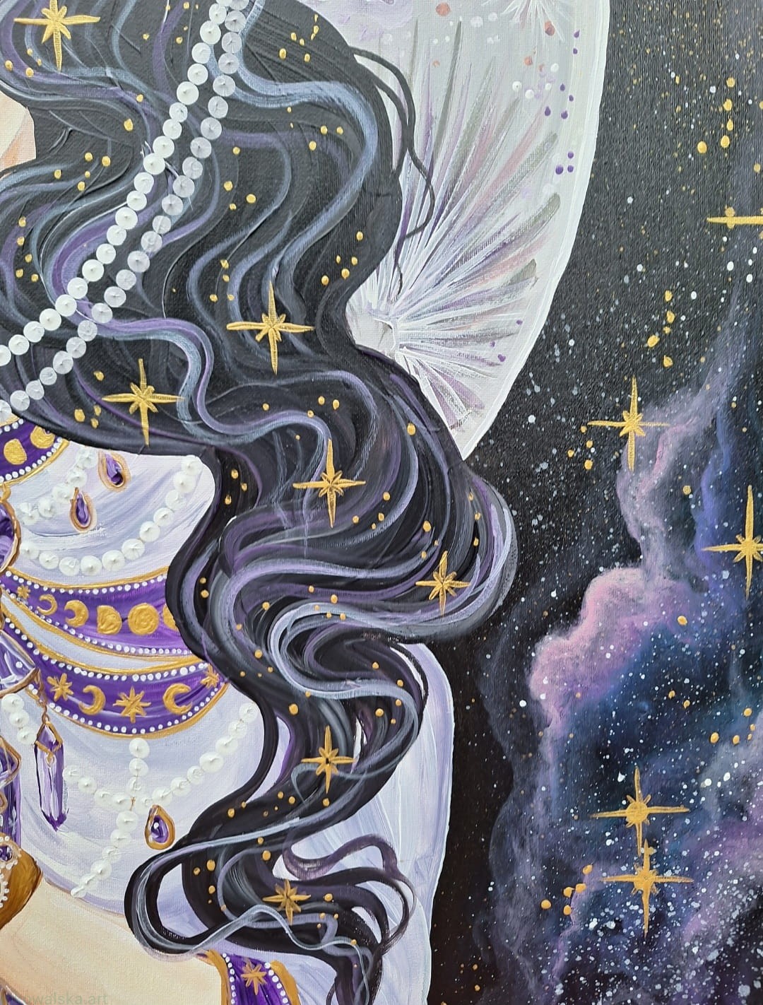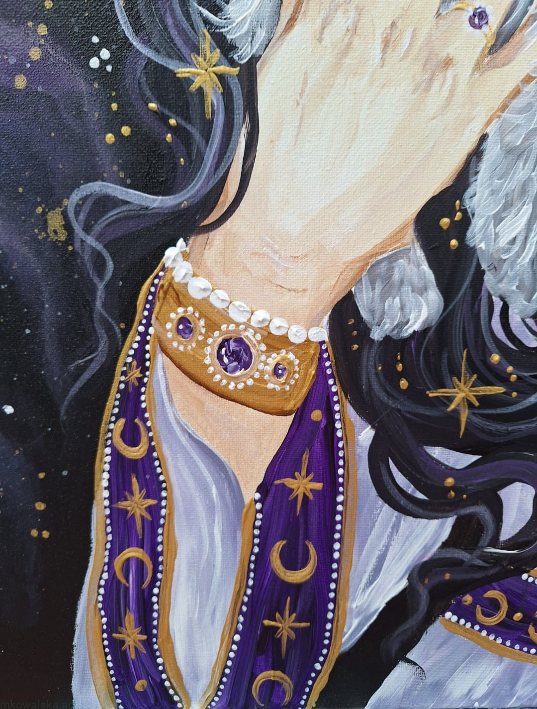 Na moim obrazie umieściłam kilka elementów nawiązujących do nocy: magiczne nocne stworzenie jakim jest kot, gwiazdy, mgławicę. Zwróć uwagę na dekoracyjny kokosznik (ozdobę z głowy) oraz bogato zdobiony naszyjnik z ametystami.