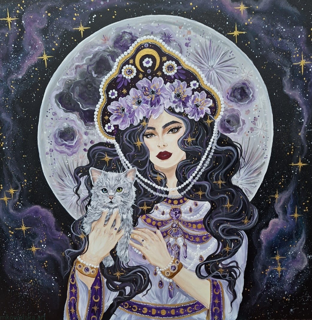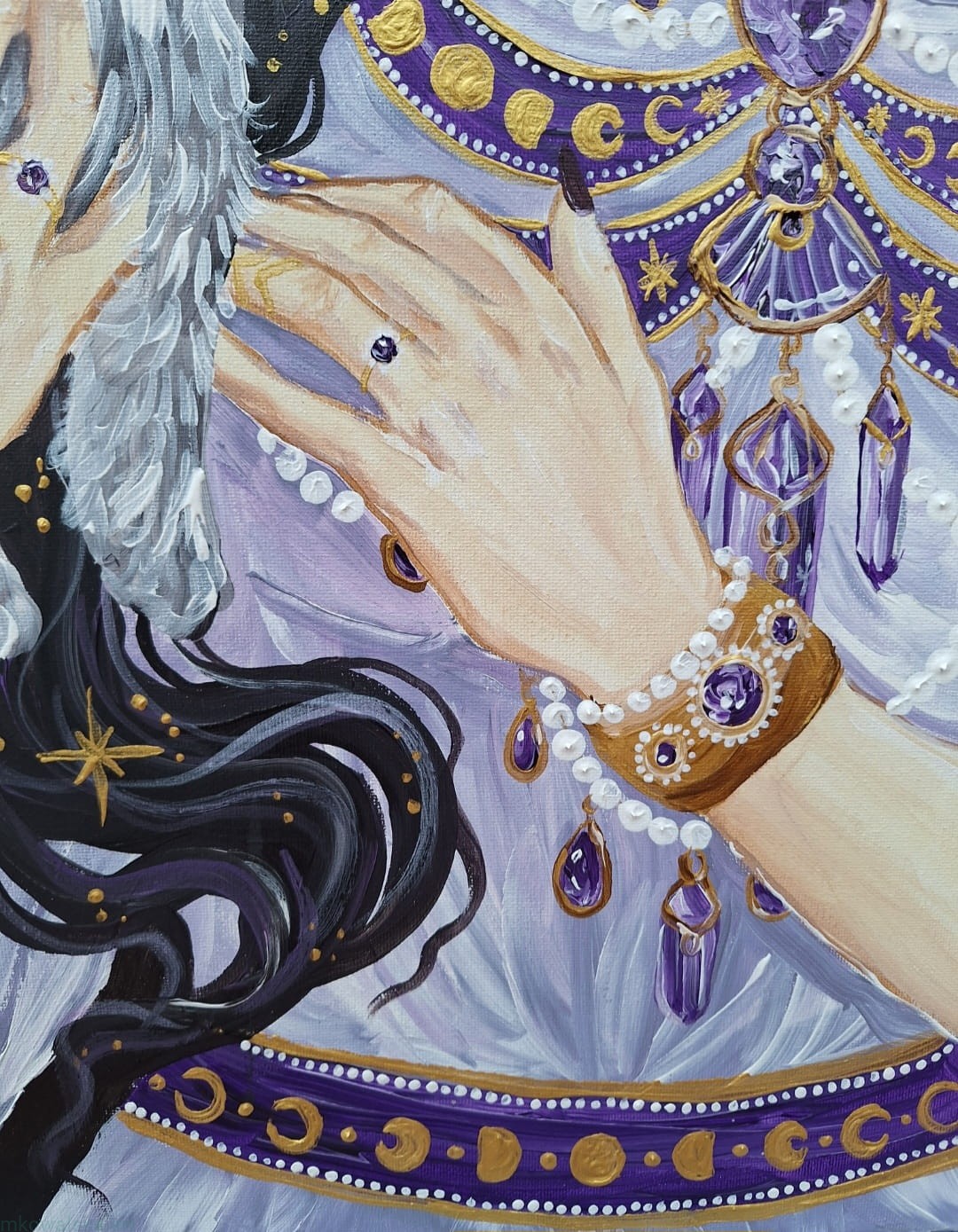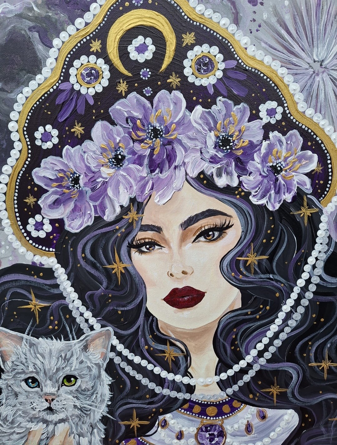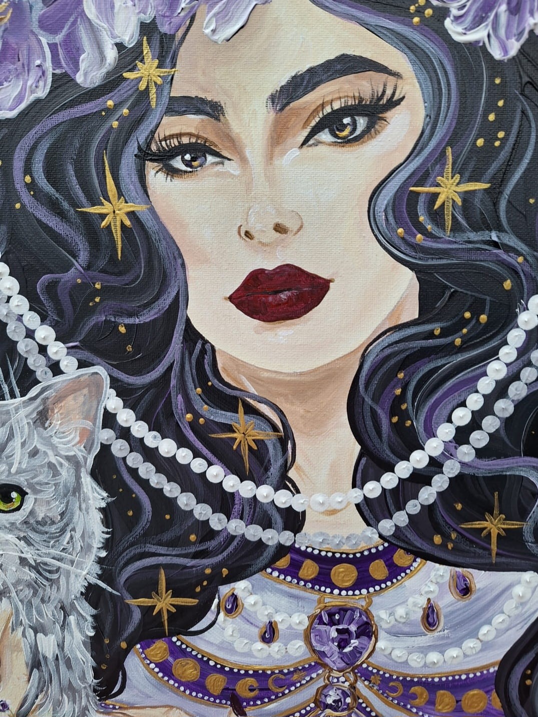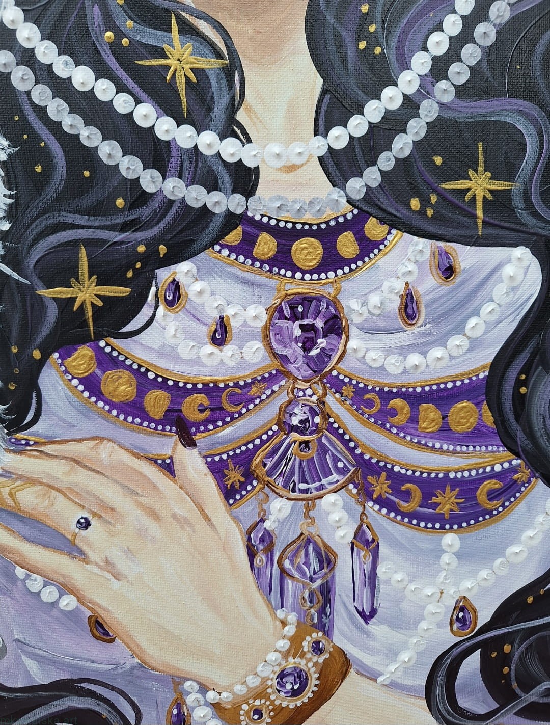 Na moim obrazie umieściłam kilka elementów nawiązujących do nocy: magiczne nocne stworzenie jakim jest kot, gwiazdy, mgławicę. Zwróć uwagę na dekoracyjny kokosznik (ozdobę z głowy) oraz bogato zdobiony naszyjnik z ametystami.