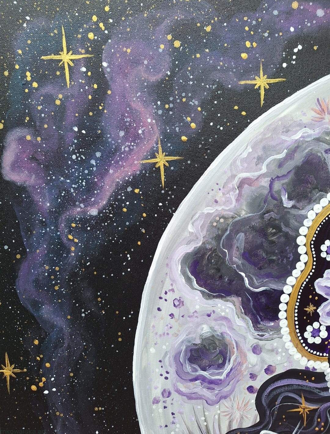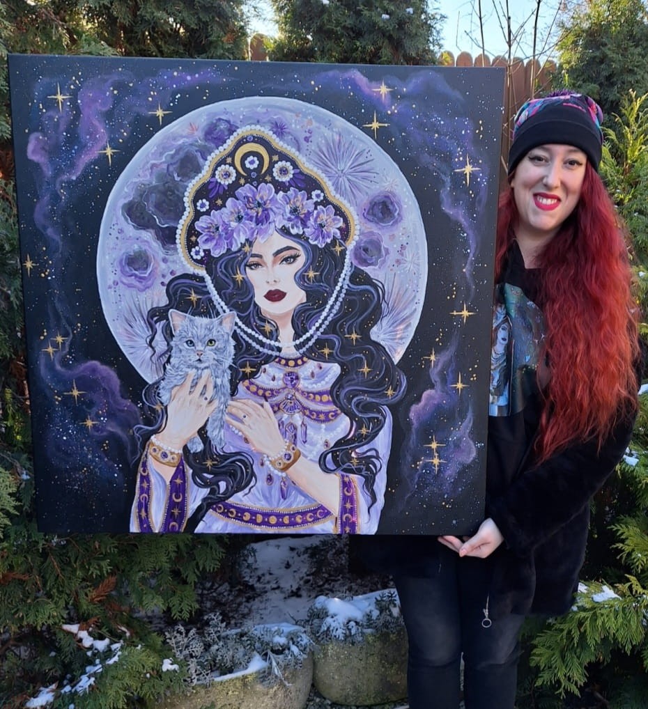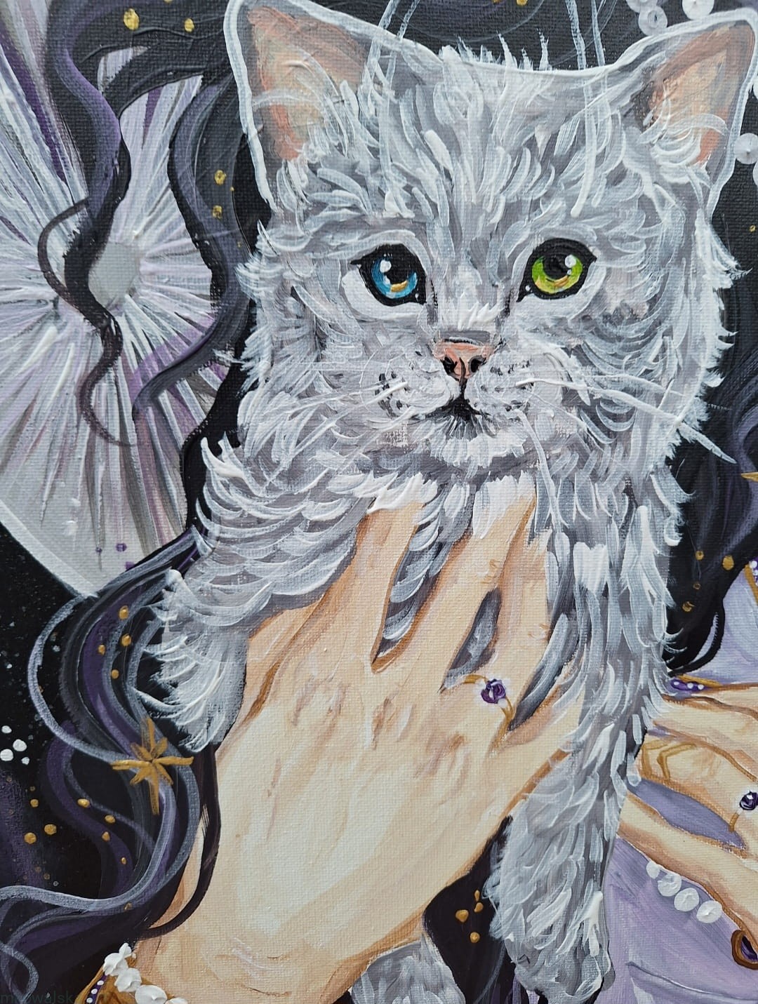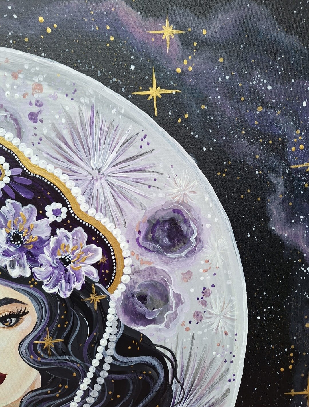 Na moim obrazie umieściłam kilka elementów nawiązujących do nocy: magiczne nocne stworzenie jakim jest kot, gwiazdy, mgławicę. Zwróć uwagę na dekoracyjny kokosznik (ozdobę z głowy) oraz bogato zdobiony naszyjnik z ametystami.