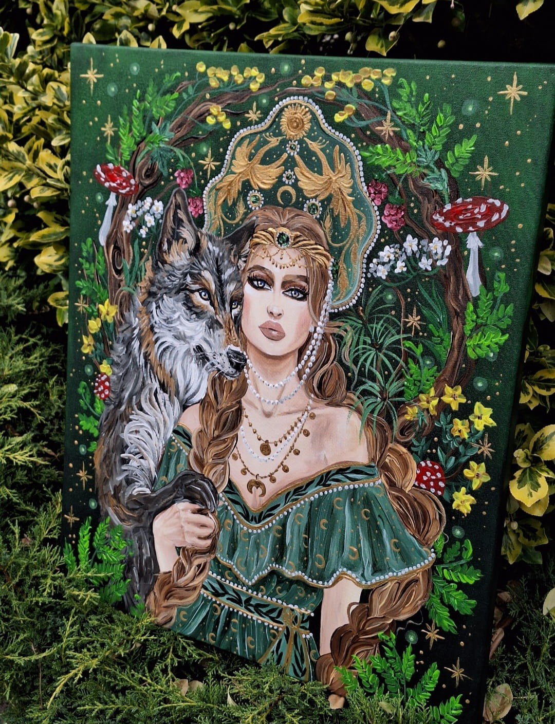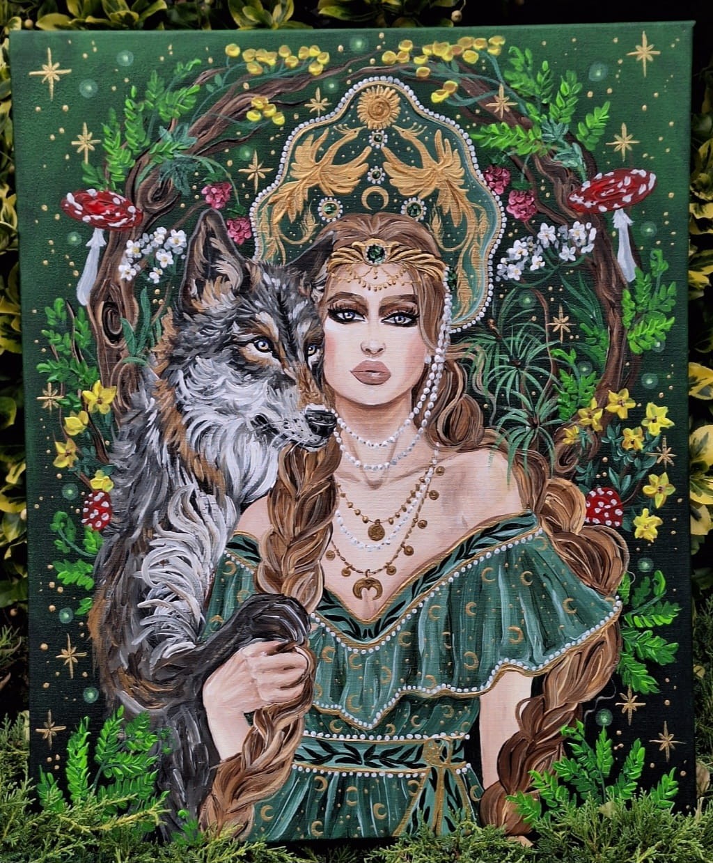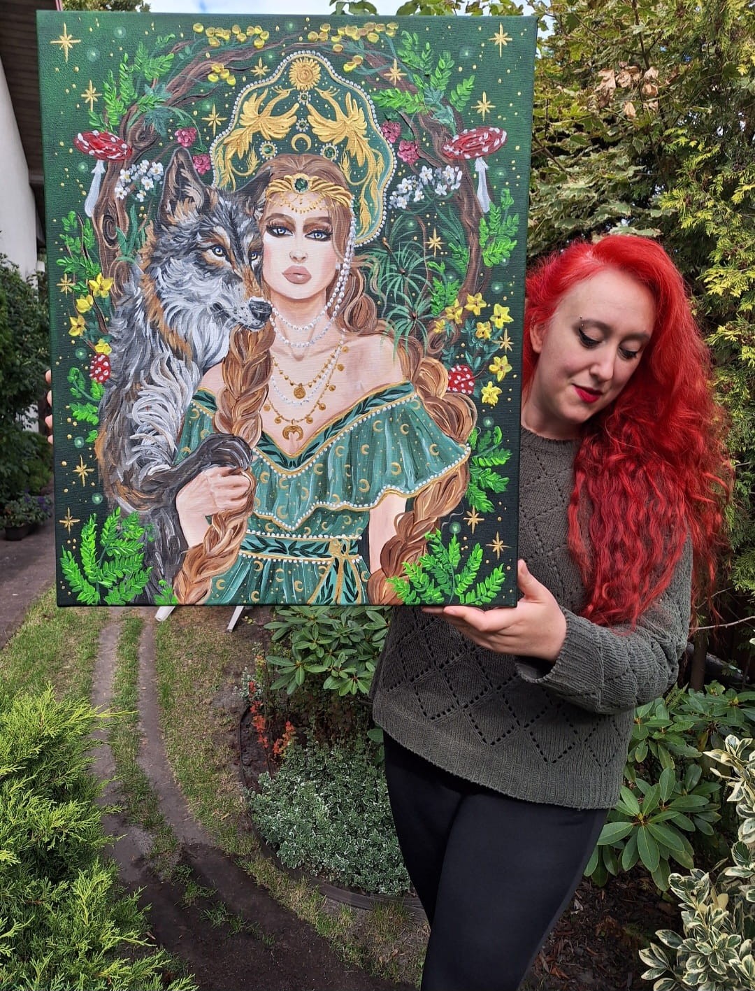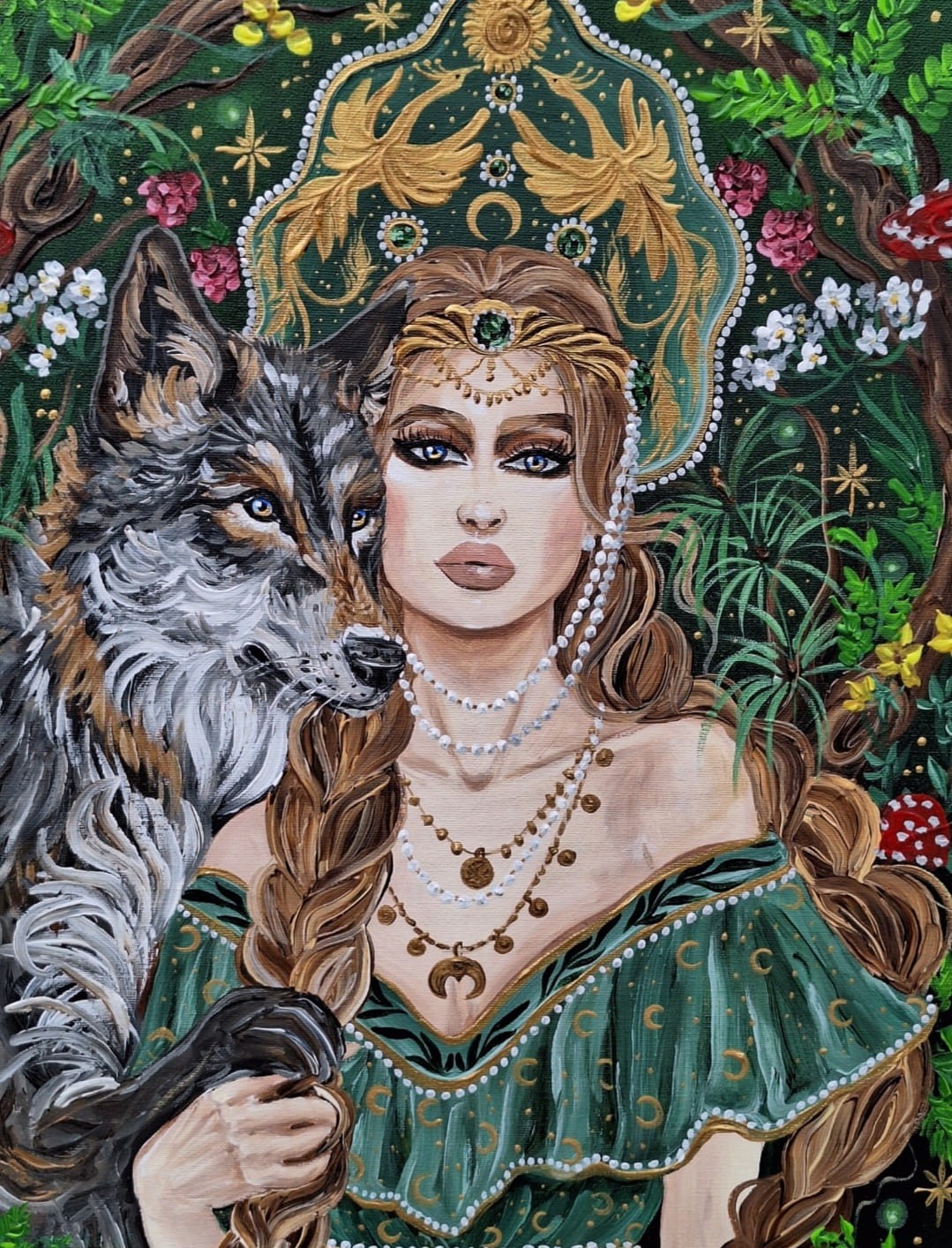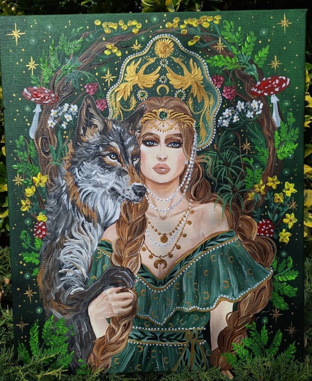 Obraz przedstawia młodą kobietę, z dwoma grubymi warkoczami, ubraną w zieloną sukienkę z leśnymi i księżycowymi motywami.