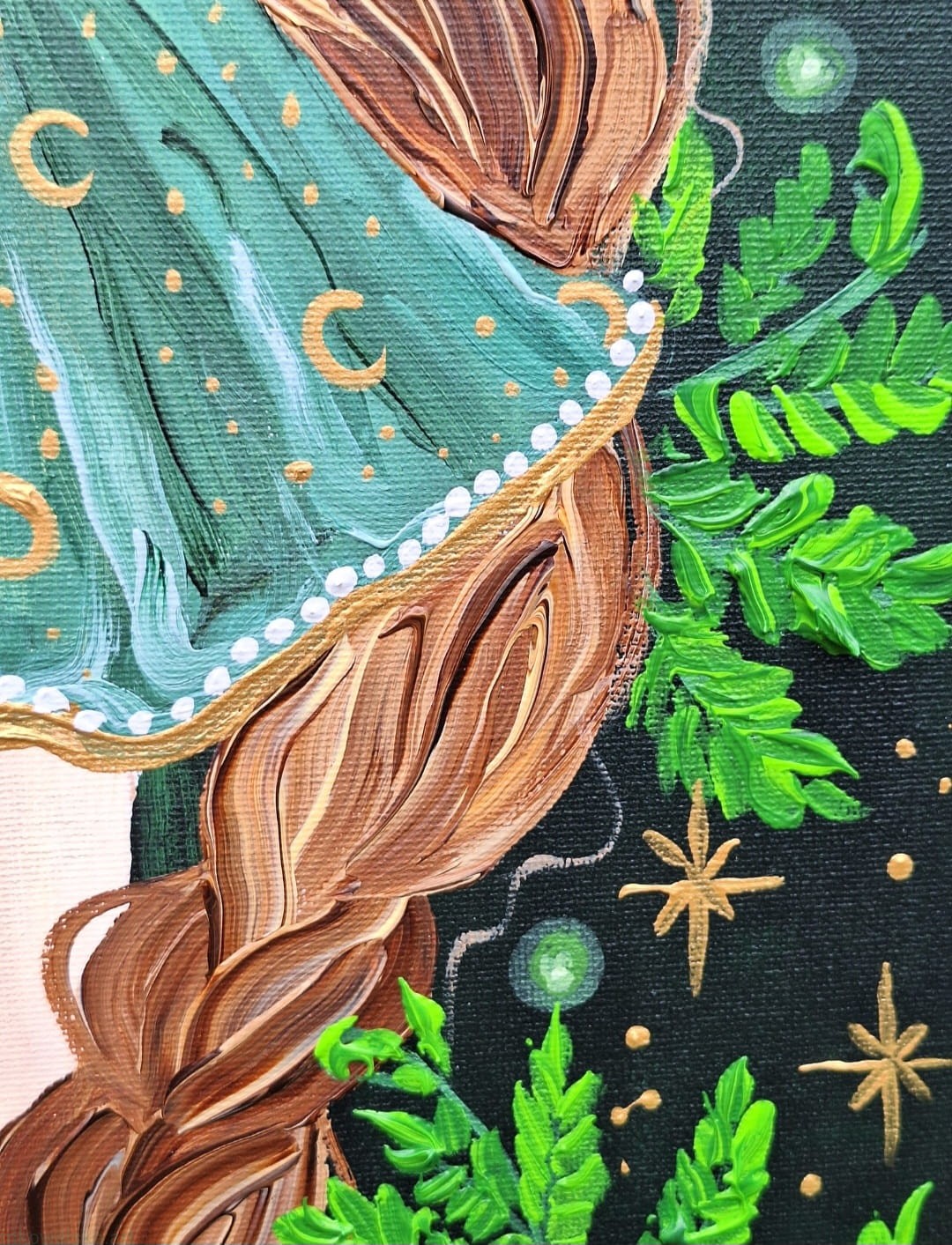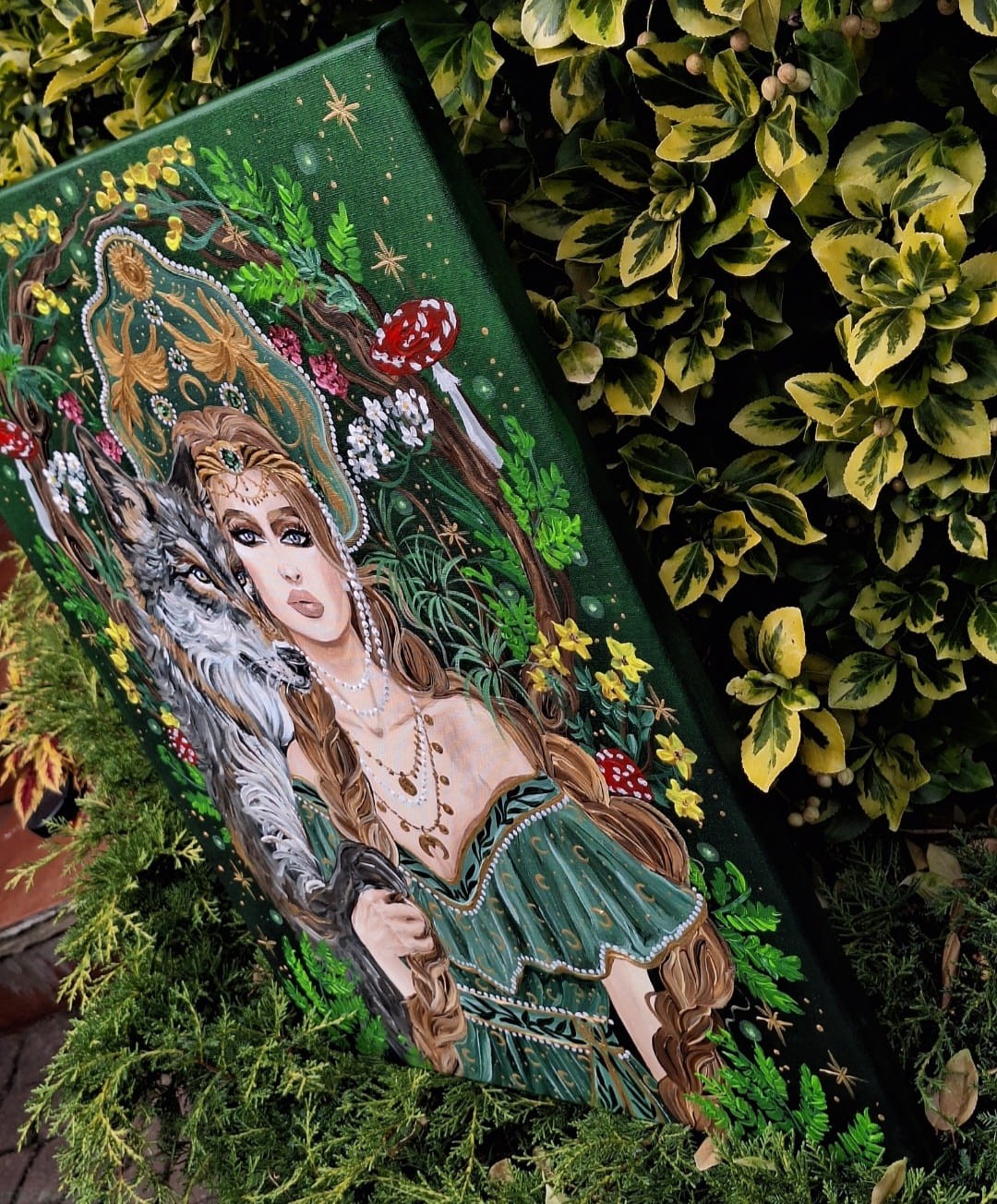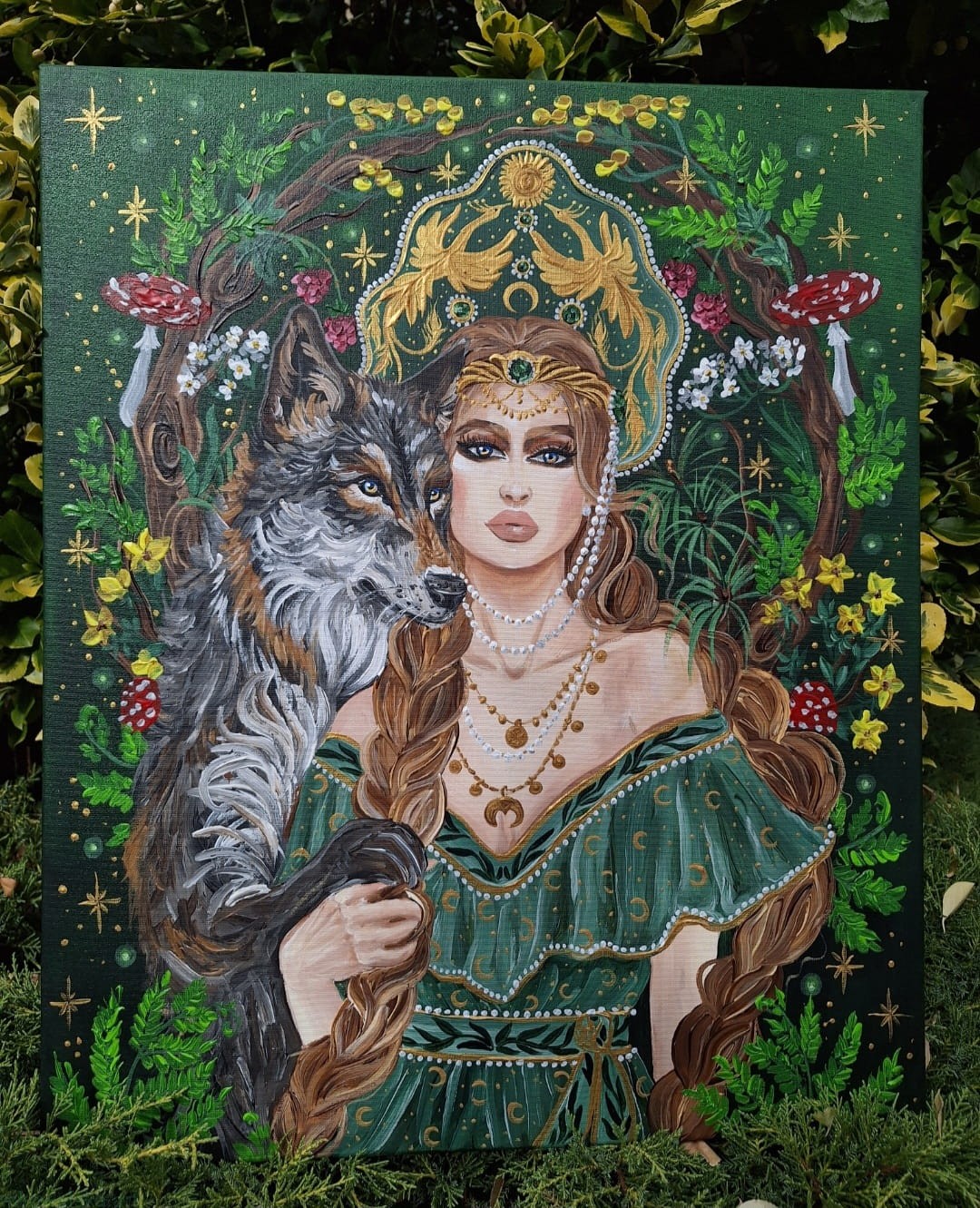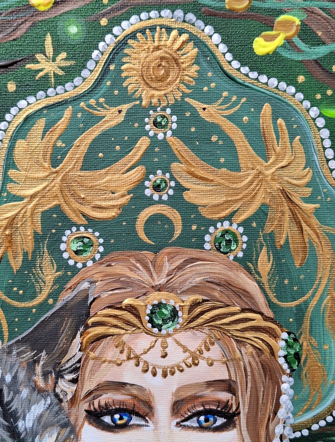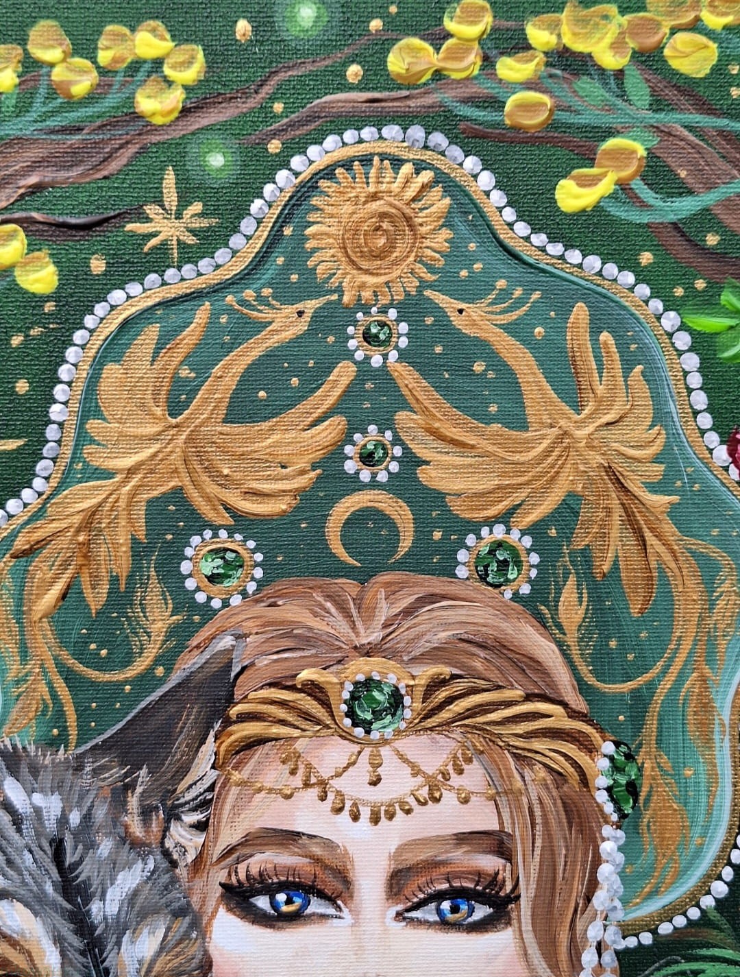 Obraz przedstawia młodą kobietę, z dwoma grubymi warkoczami, ubraną w zieloną sukienkę z leśnymi i księżycowymi motywami.