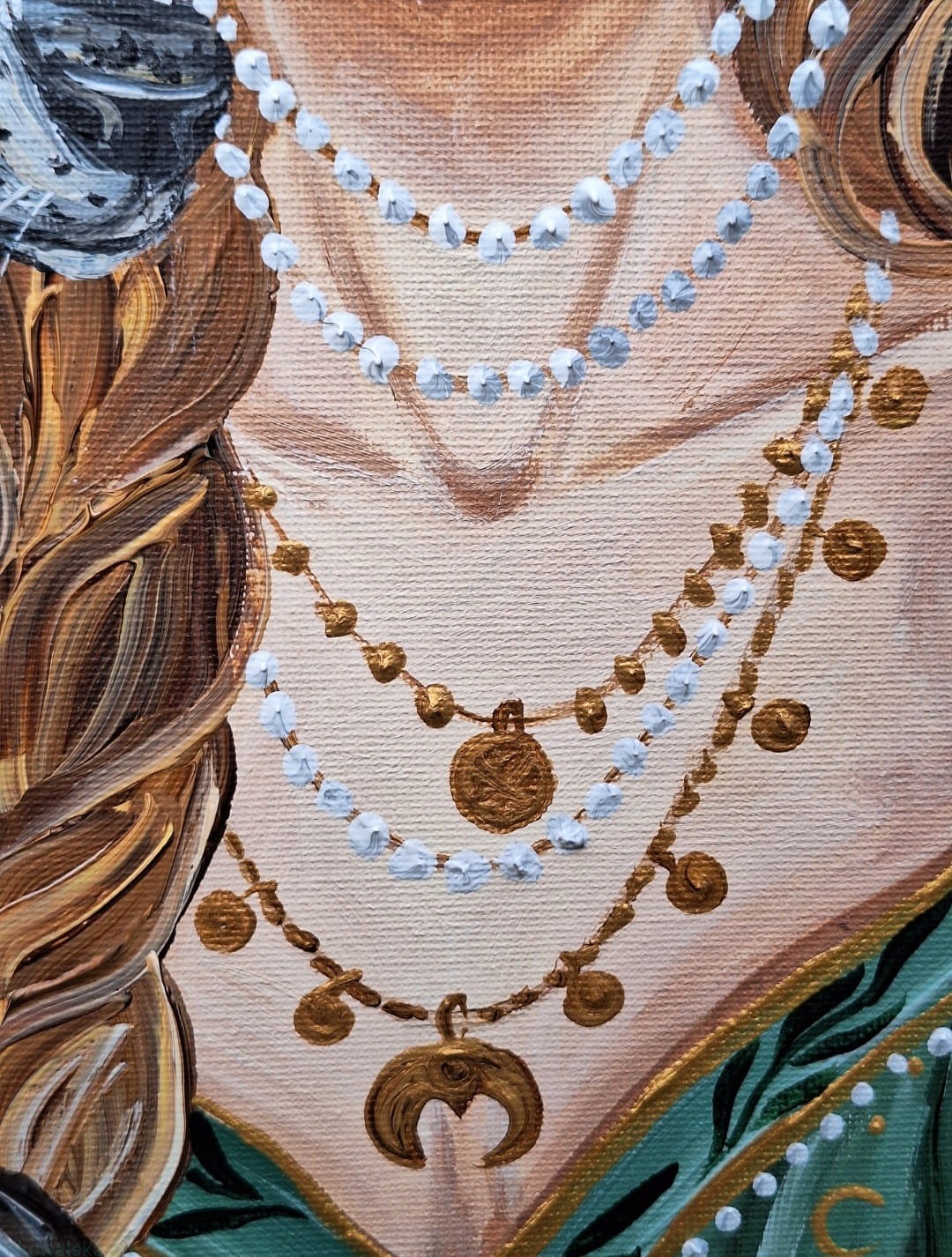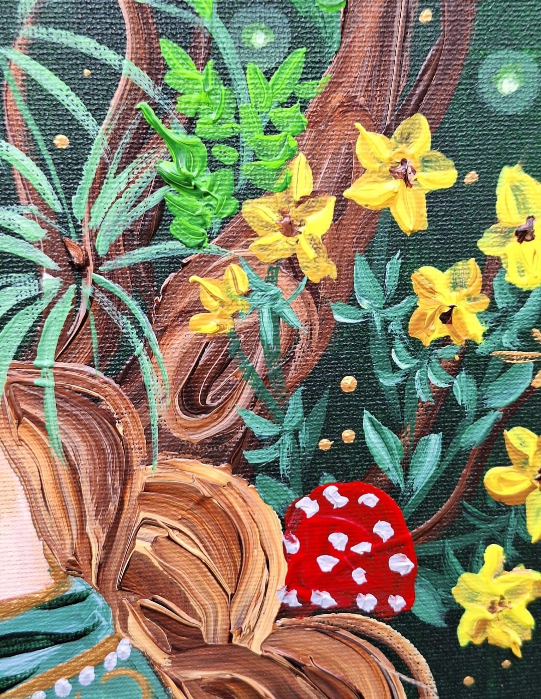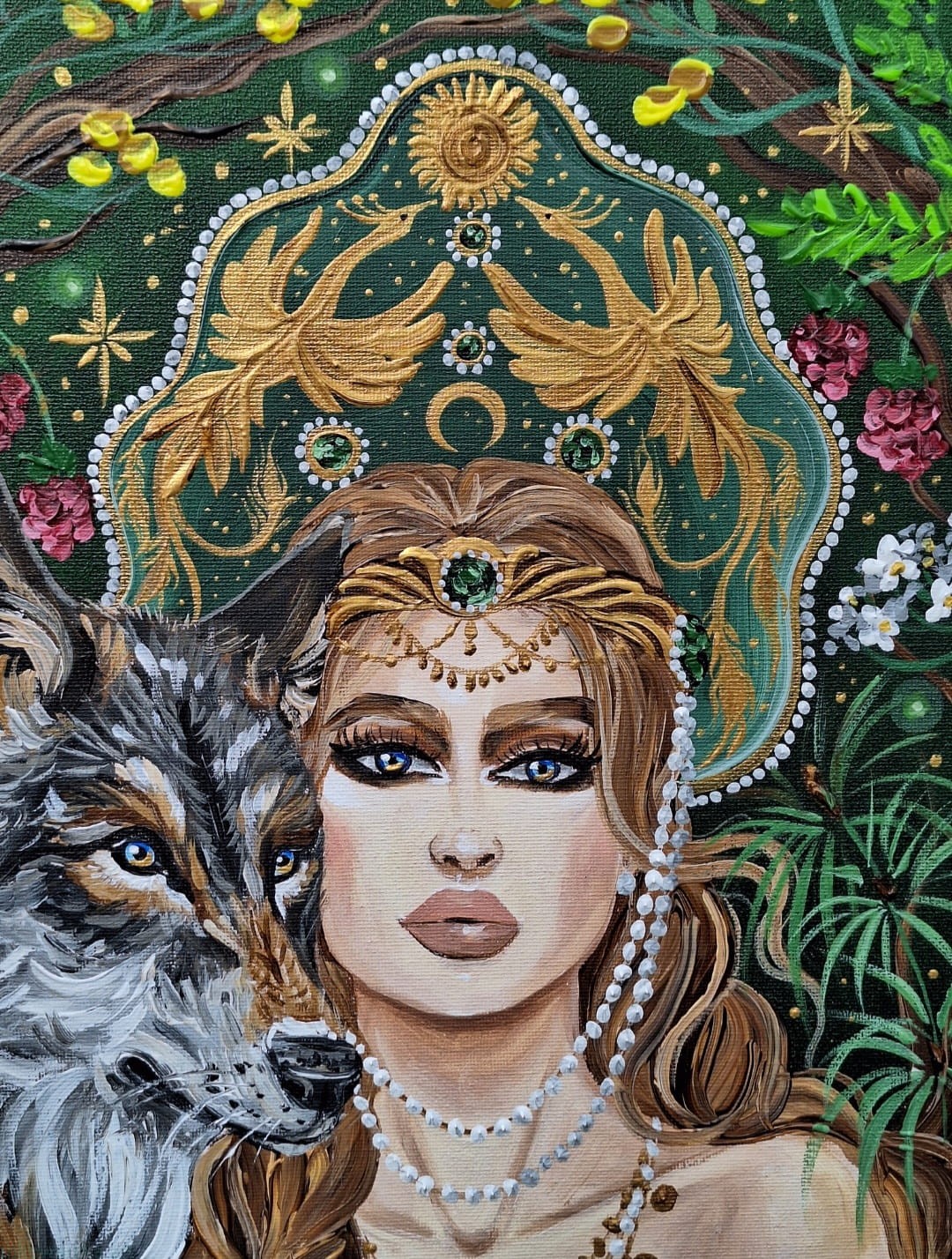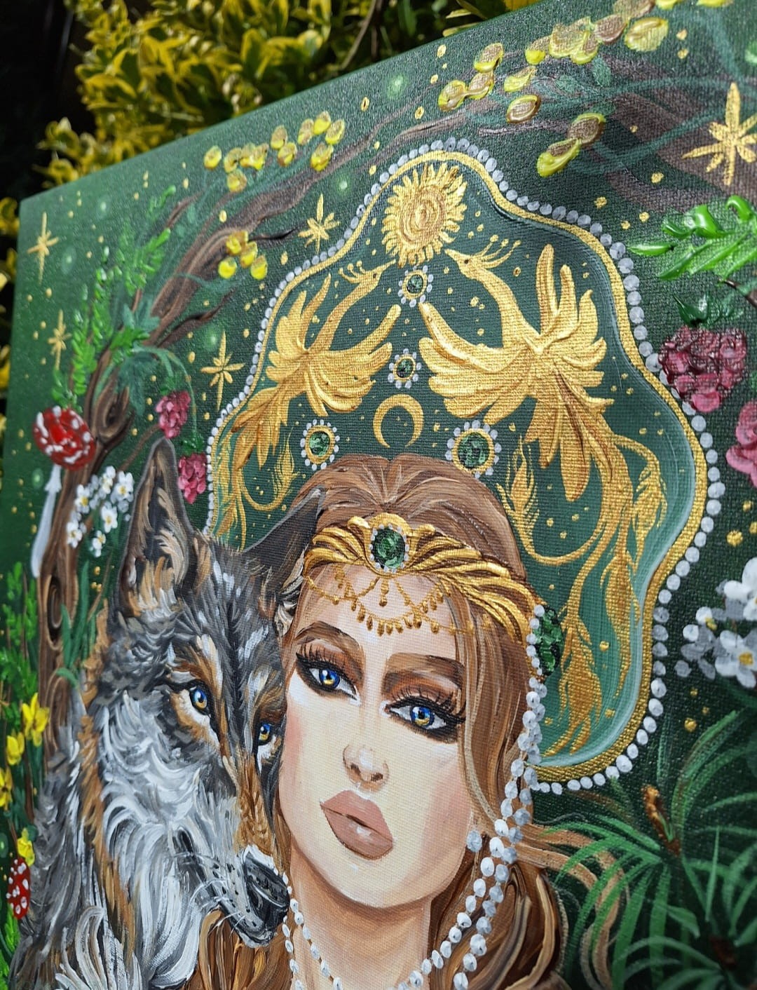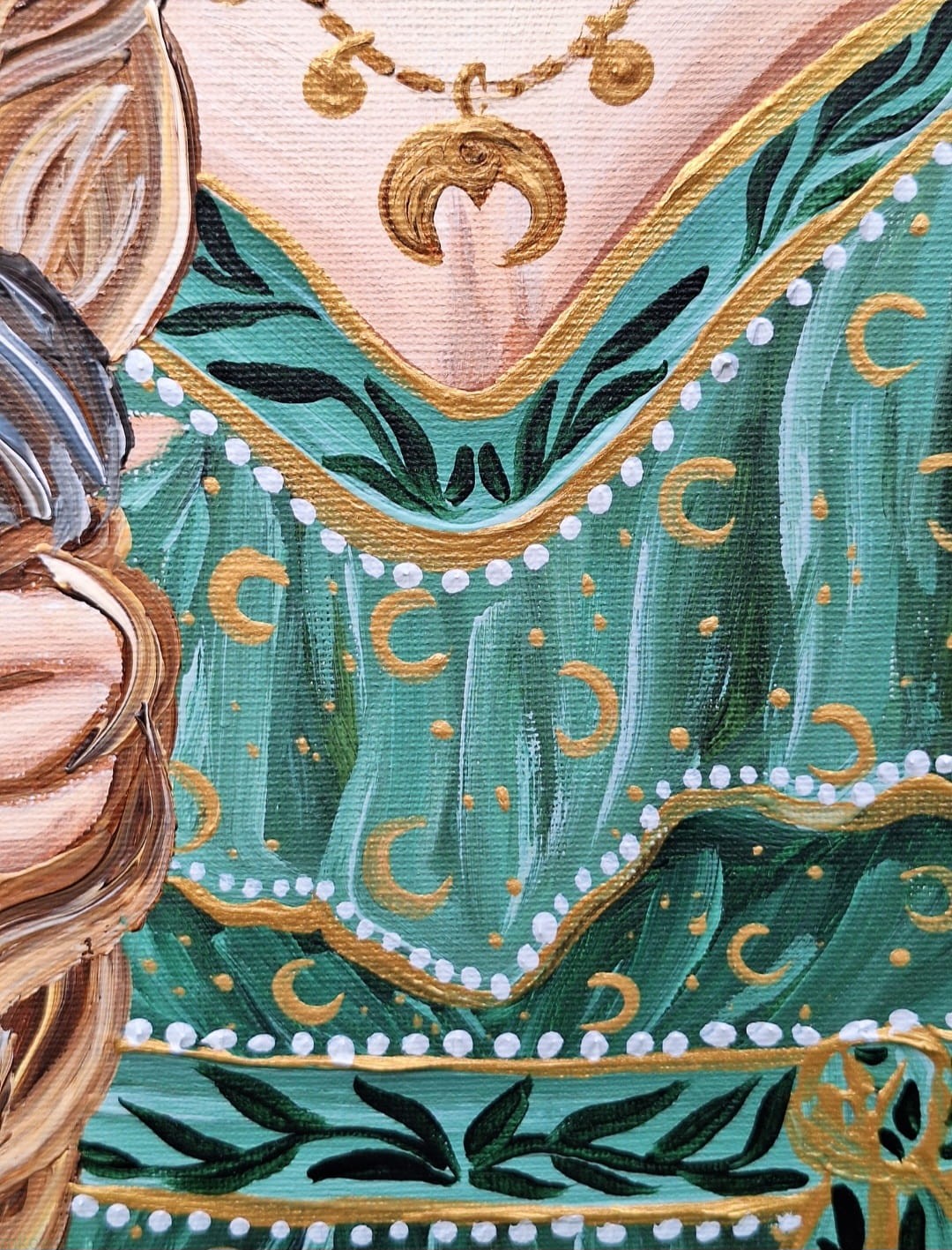 Obraz przedstawia młodą kobietę, z dwoma grubymi warkoczami, ubraną w zieloną sukienkę z leśnymi i księżycowymi motywami.