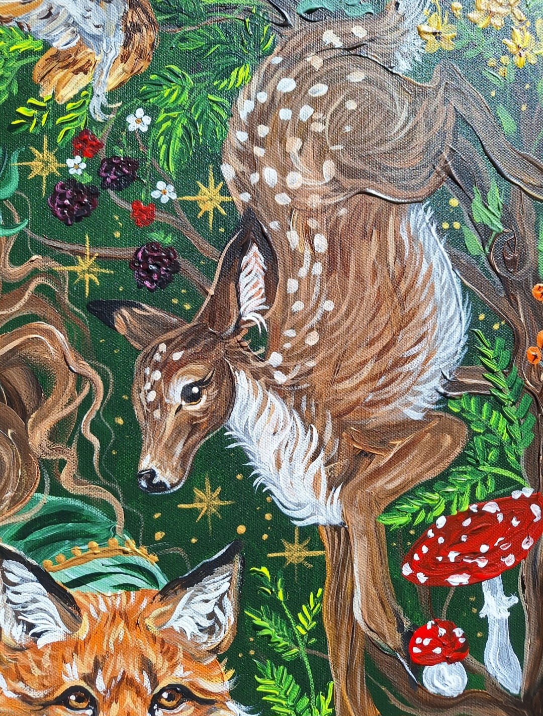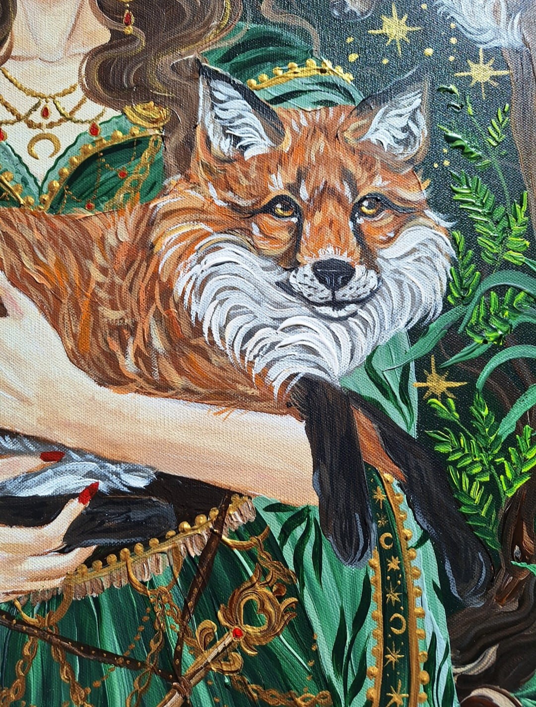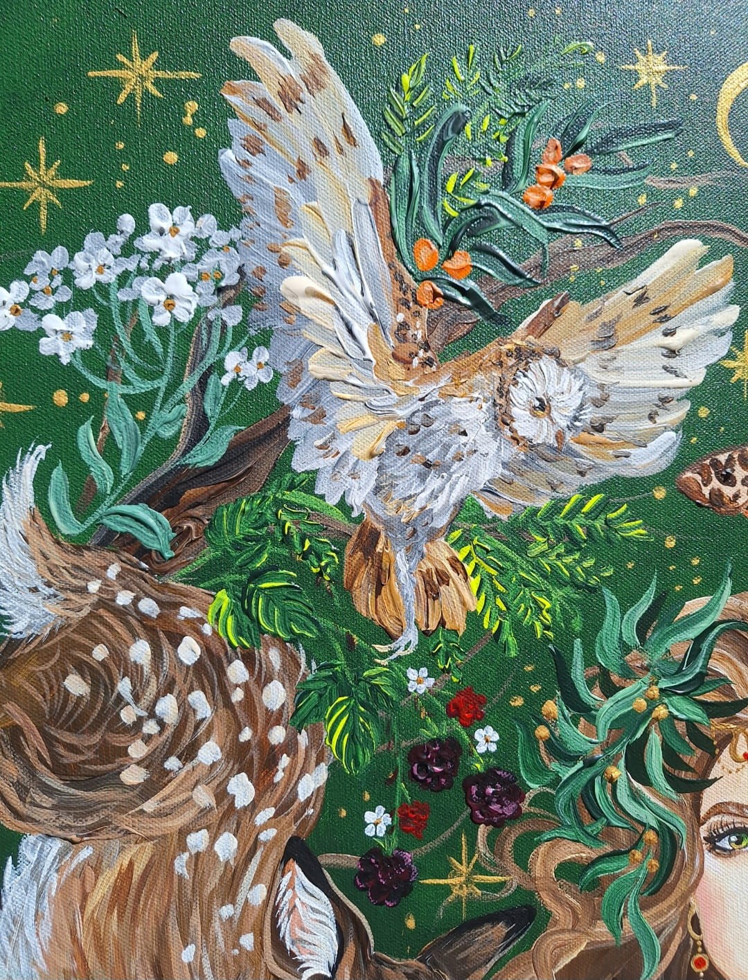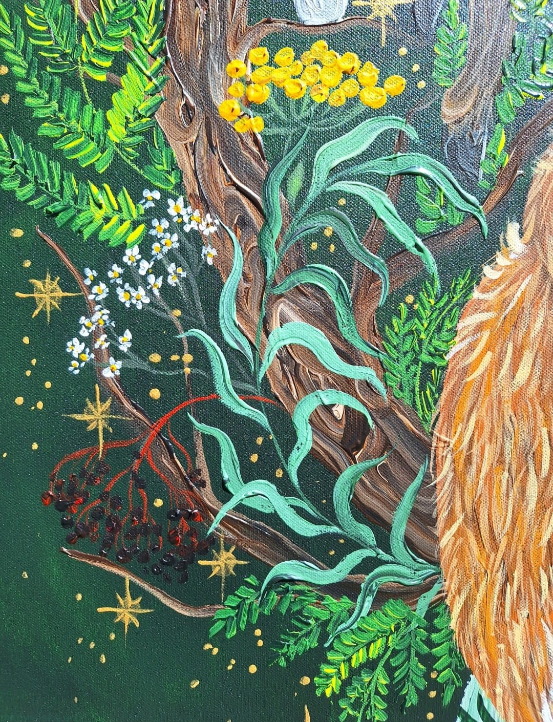 Wiedunka jest silnie związana z energią Lasu i Przyrody: w ramionach trzyma ufnego lisa, dookoła niej skłaczą bez strachu młode sarenki, nad głową dwie sówki płomykówki – jako symbol wiedzy i mądrości, ćma inspirowana żyjącą w Polsce ćmą niedźwiedziówką.