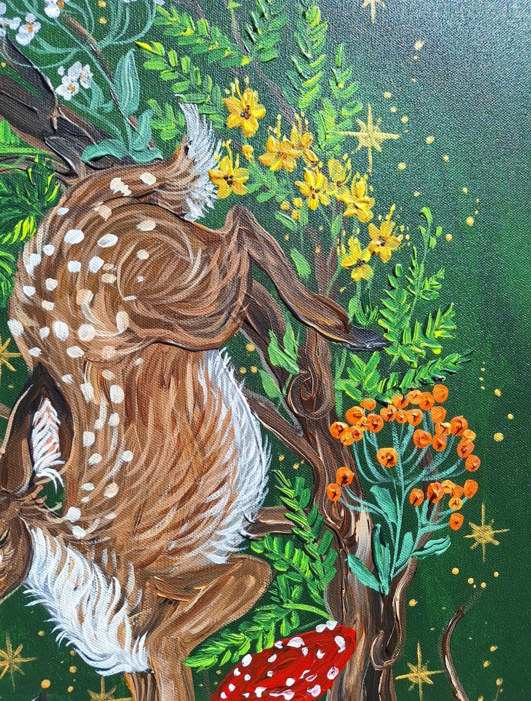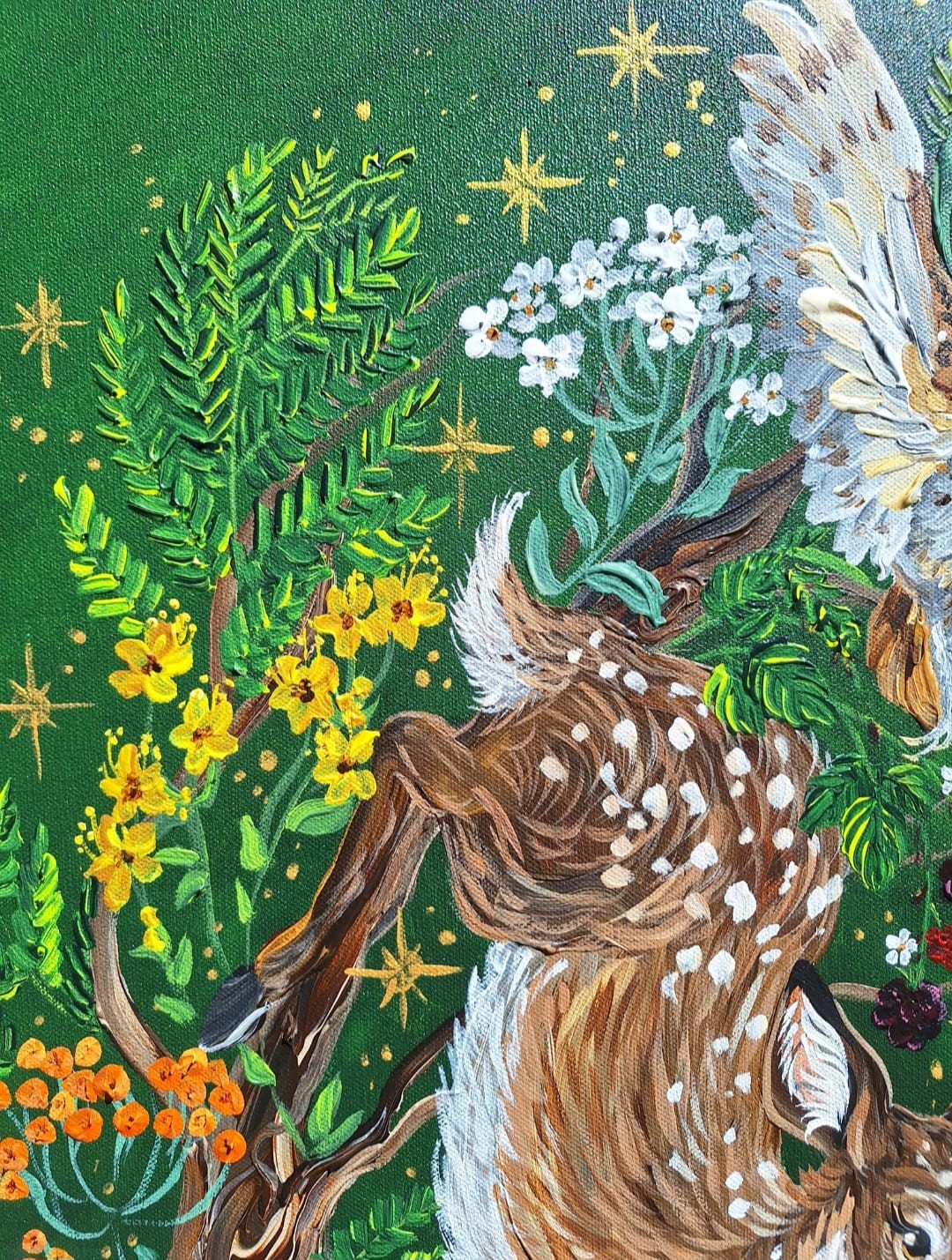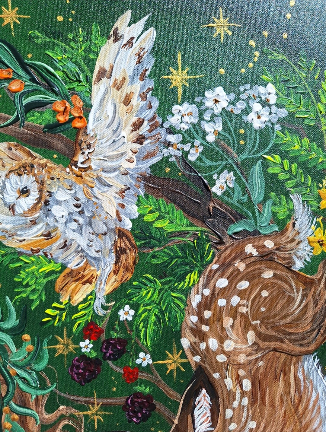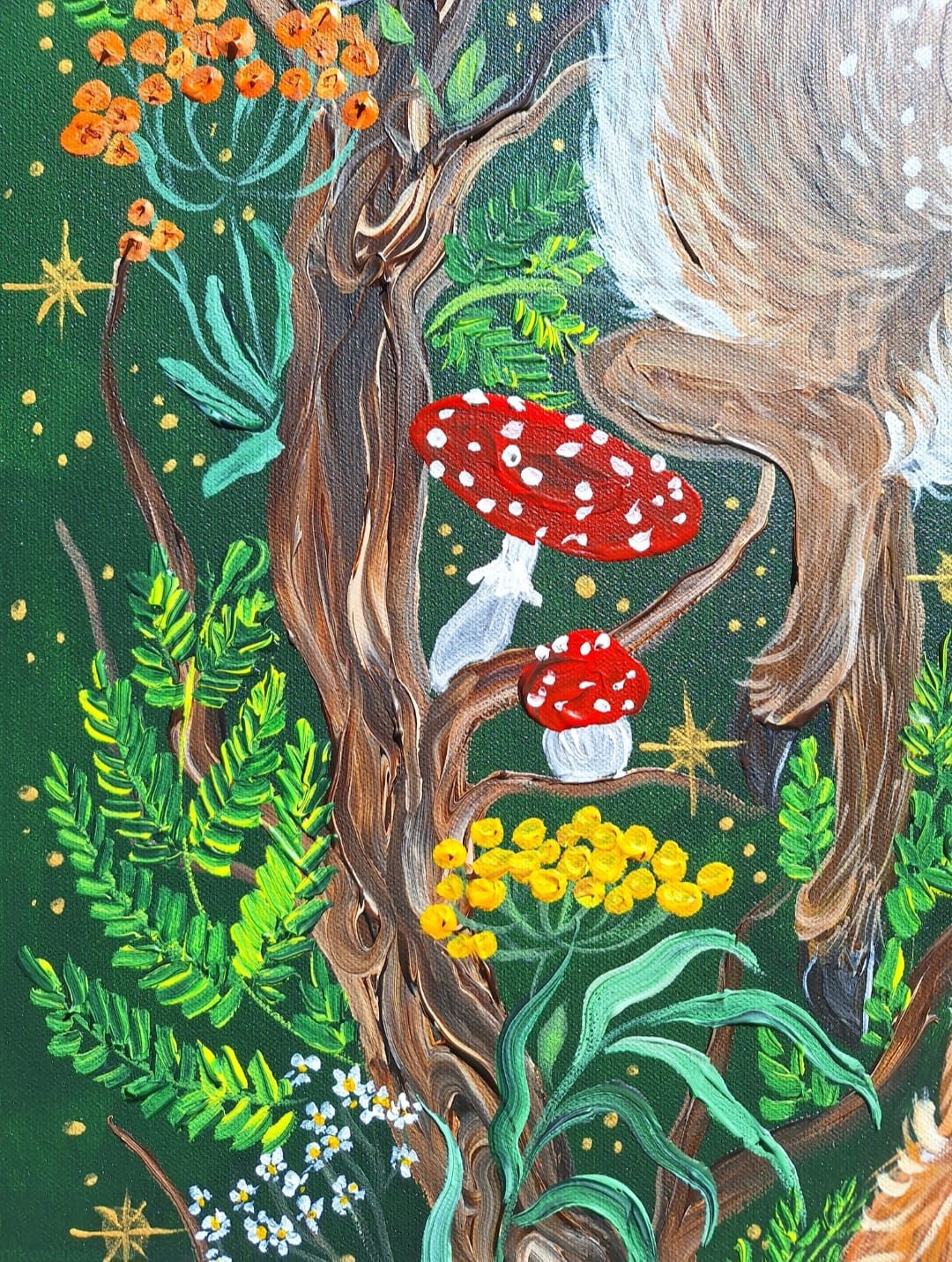 Wiedunka jest silnie związana z energią Lasu i Przyrody: w ramionach trzyma ufnego lisa, dookoła niej skłaczą bez strachu młode sarenki, nad głową dwie sówki płomykówki – jako symbol wiedzy i mądrości, ćma inspirowana żyjącą w Polsce ćmą niedźwiedziówką.