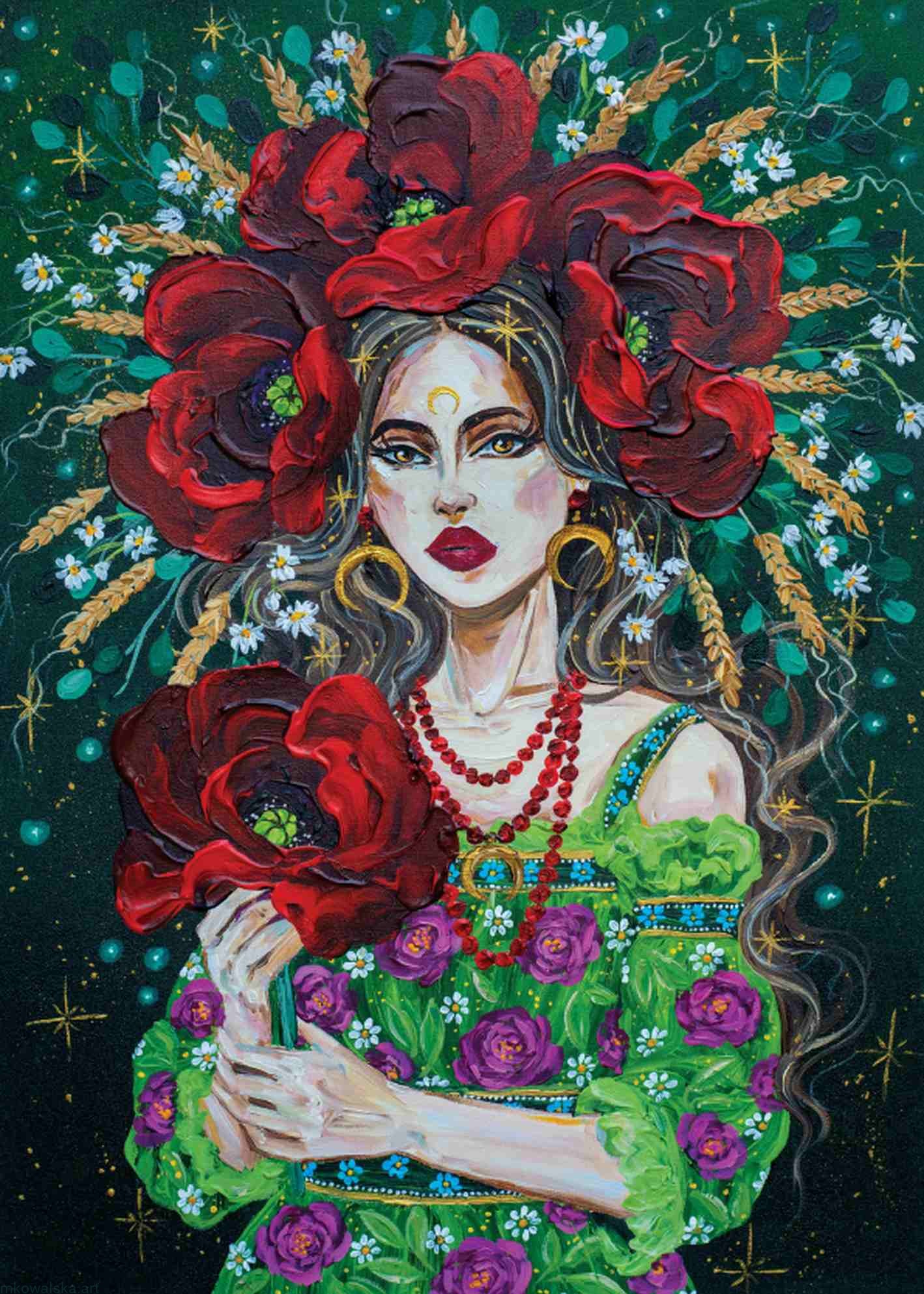 Łąka – pierwszy obraz z serii „Słowiańska botanika”, w której chciałabym przybliżyć piękno botaniki (roślin, ziół, kwiatów). Będziemy przemierzać wiejskie pola i łąki, wyzłocone zbożem i zapachem rumianków. Zawiesimy oczy na intensywnych kolorach wiosny i lata, na jesień odpoczniemy wśród sadów z jabłkami i gruszkami, w zimę zaśniemy otuleni zapachem żywicy sosnowej.