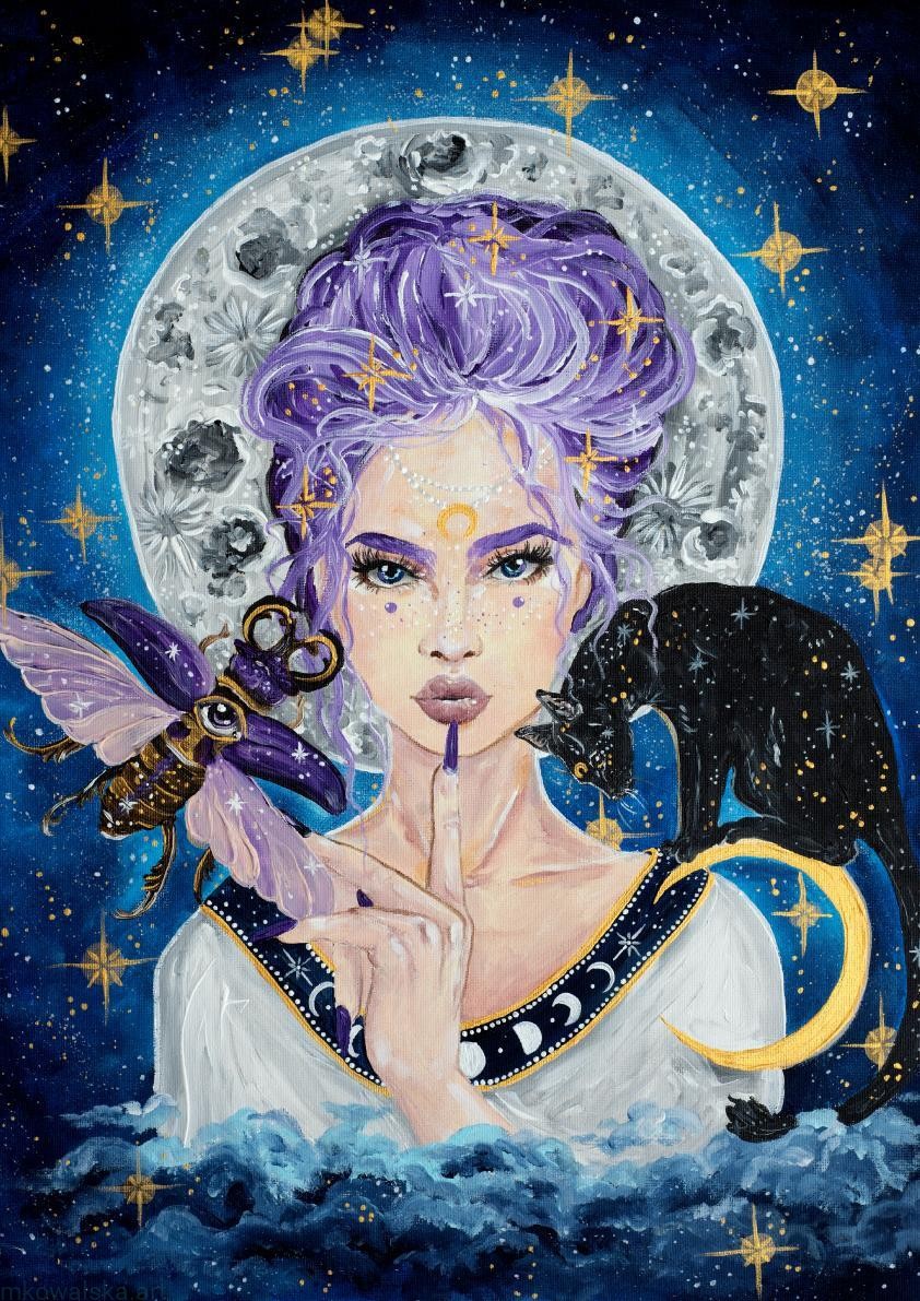 W tej interpretacji sztuki, Selene jest przedstawiona jako młoda, nastoletnia czarownica z fioletowymi włosami, stojąca przed pełnym księżycem, a obok niej możesz dojrzeć czarnego kota, który siedzi na dużym półksiężycu, dodając do mistyki do całego obrazu. Jeśli przyjrzysz się bliżej, dostrzeżesz złotego żuka z wszechwidzącym okiem.