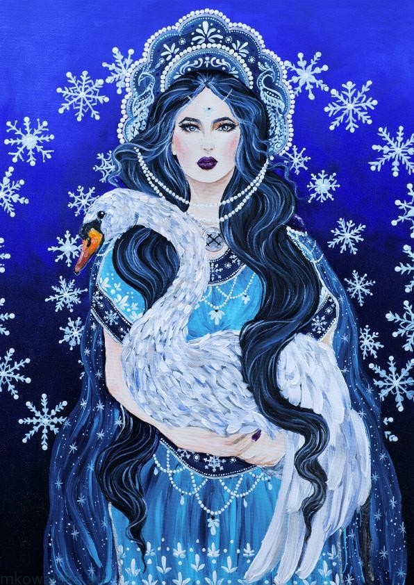 To moja druga już interpretacja tej słowiańskiej bogini. Ponownie ksupiam się na jej zimowym aspekcie. Na obrazie znajdziesz łabędzia, który kojarzy się z zimą ale też bajką ludową o księżniczce łabędzi, która ratowała swoich 7 lub 9 braci zaklętych w łabędzie. Bajka znana jest głównie na terenach wschodniej słowiańszczyzny.