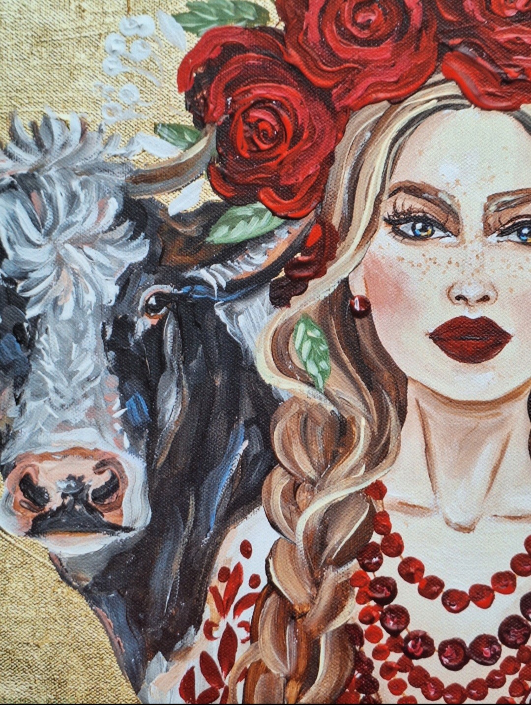 Marysieńka - obraz z serii Glamour Slavic Folk, w której łączę inspiracje sztuką ludową (nurt w sztuce: prymitywizm), folklorem oraz zestawiam go z bogactwem złota.
