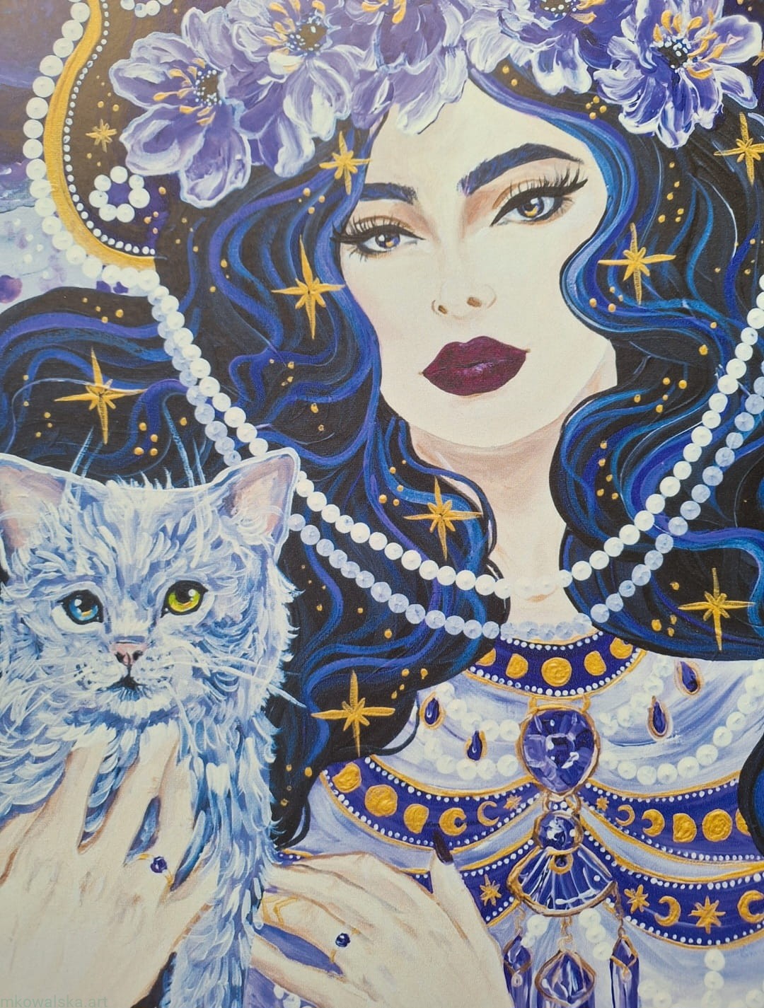Obraz stworzony u schyłku 2023 roku, format 90x90 cm. Przedstawia jedną z trzech sióstr Zórz: Zorzę nocną. W folklorze polskim Zorza występuje w trzech osobach: Poranna, Wieczora i Nocna. Łączy się je z Rodzanicami – czyli tkaczkami ludzkiego losu, na podobieństwo greckich Mojr czy rzymskich Park. Na moim obrazie umieściłam kilka elementów nawiązujących do nocy: magiczne nocne stworzenie jakim jest kot, gwiazdy, mgławicę. Zwróć uwagę na dekoracyjny kokosznik (ozdobę z głowy) oraz bogato zdobiony naszyjnik z ametystami.