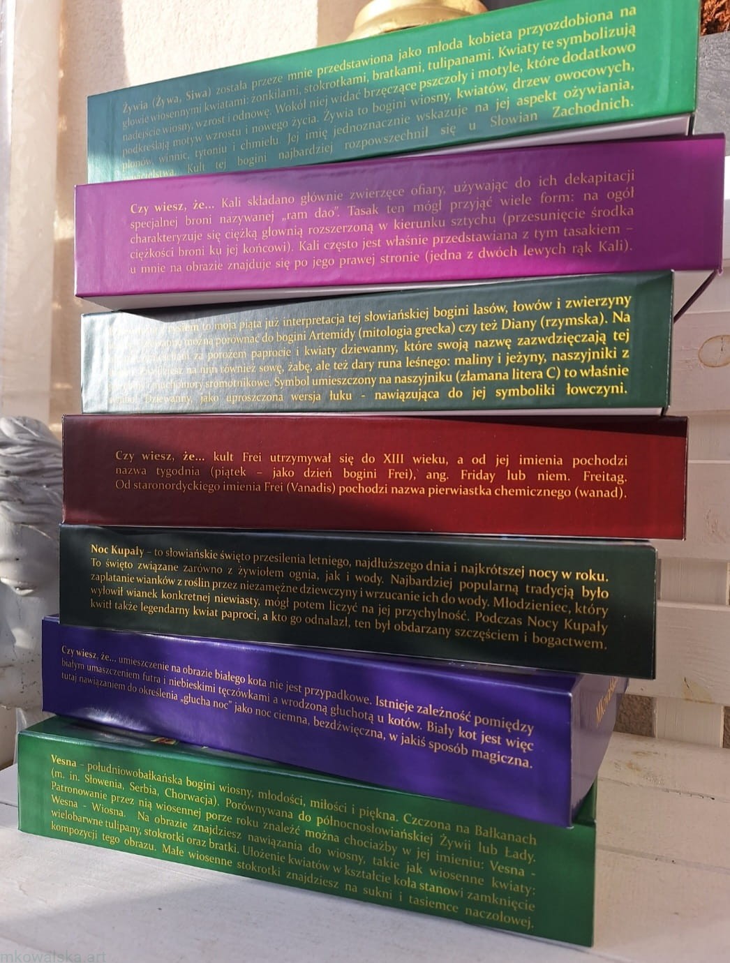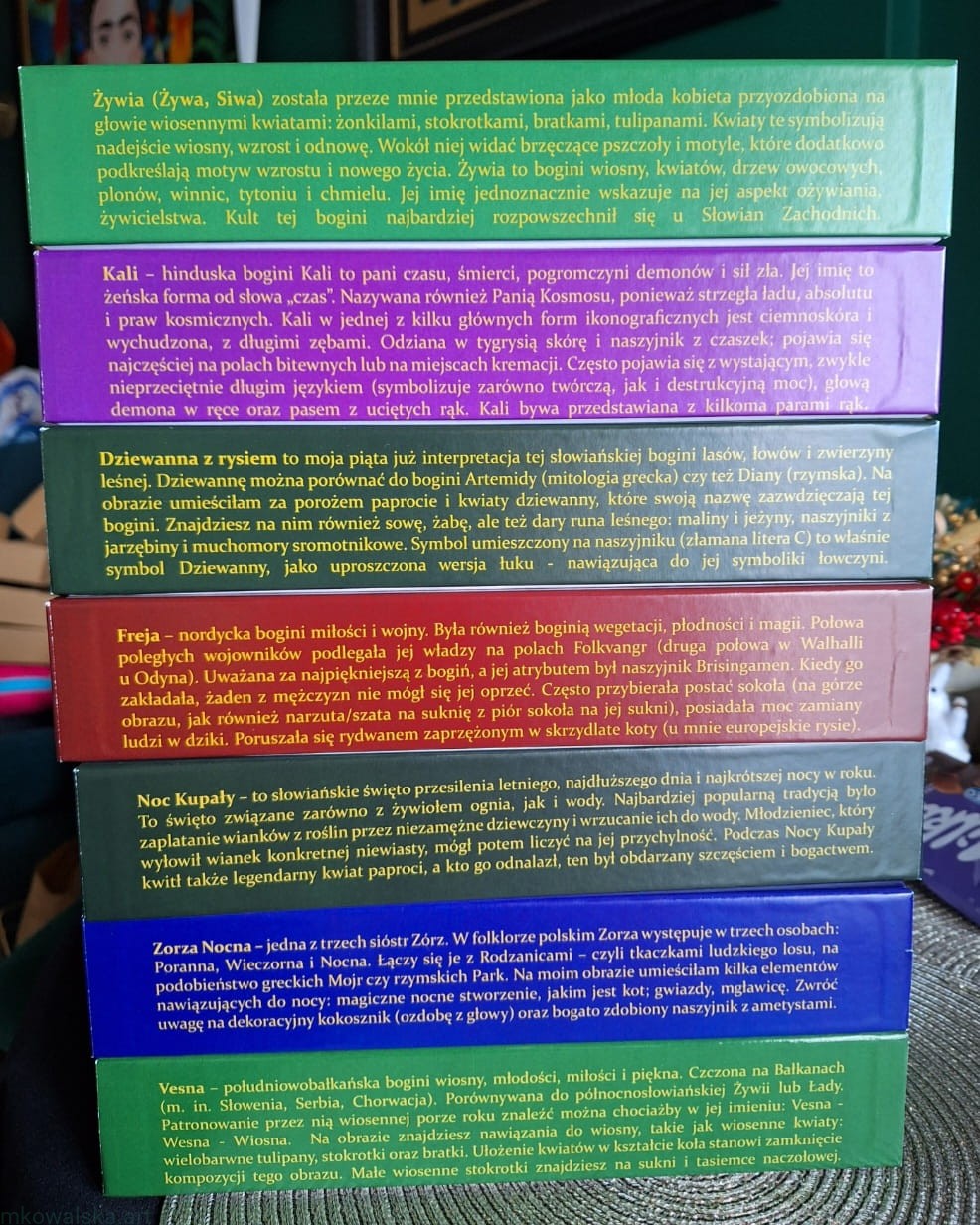 - Na jednym boku pudełka znajduje się opis bogini, na drugim zaś ciekawostka z nią związana.