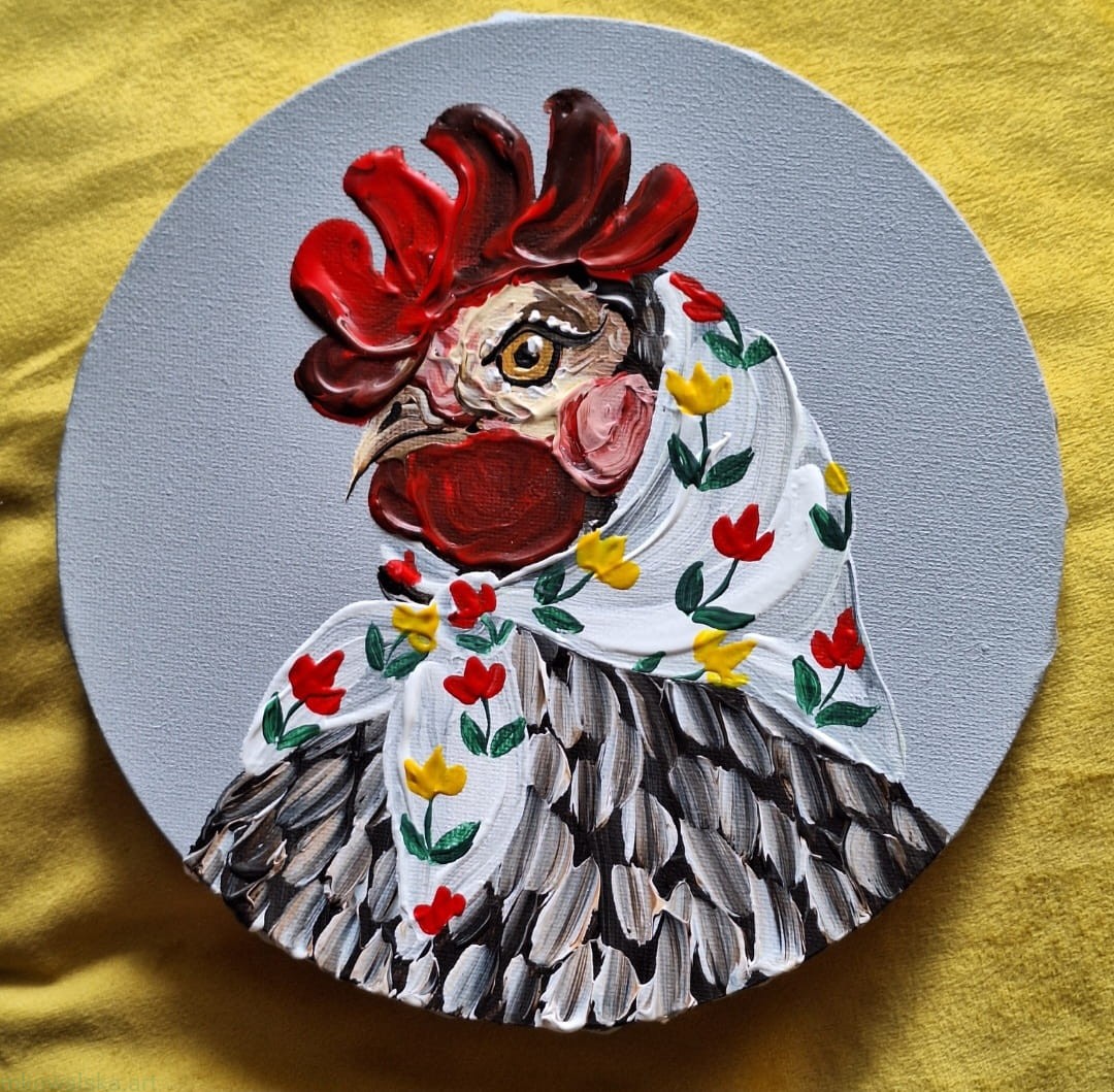 Obraz oryginalny z optymistyczną i wesołą kurką: