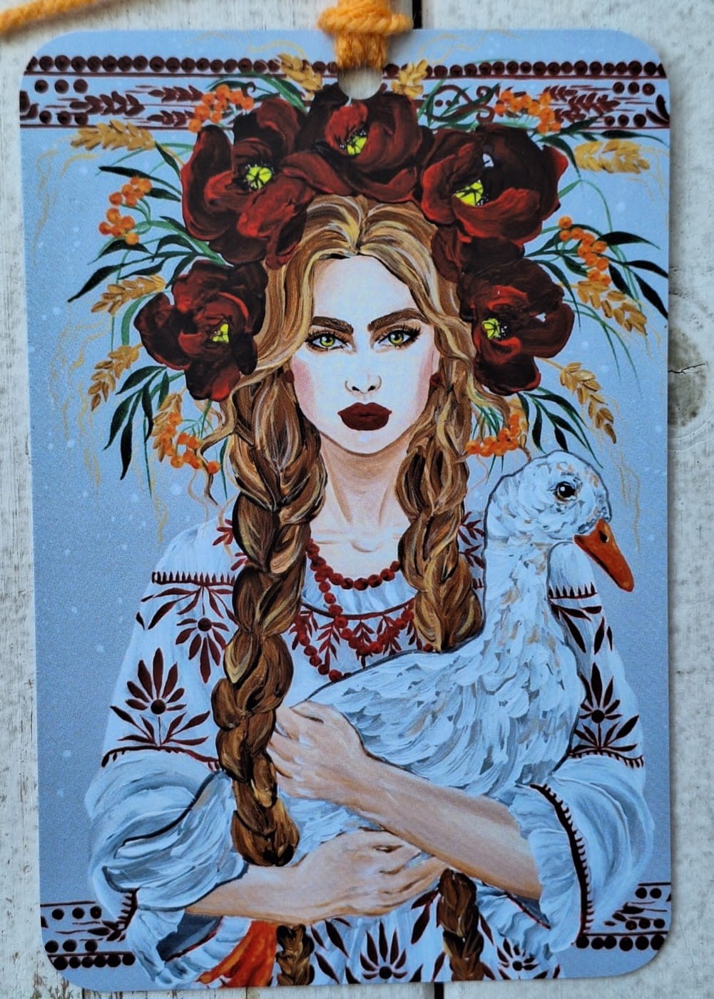 Obraz przedstawia młodą, słowiańską kobietę trzymającą w rękach białą kaczkę. Chwalimira ubrana jest w białą koszulę z haftowanymi ludowymi wzorami. Na jej głowie znajduje się ogromny kwietny czepiec z maków, zboża i jarzębiny. Biała kaczka (nspiracją była kaczka piżmowa, hodowana w Polsce) stanowi uwypuklenie intencji pokoju, miru (biel = czystość, spokój). Jarzębina w czepcu kwietnym scala wizualnie kolorystykę pomarańczową w dziobie i płetwie kaczki.