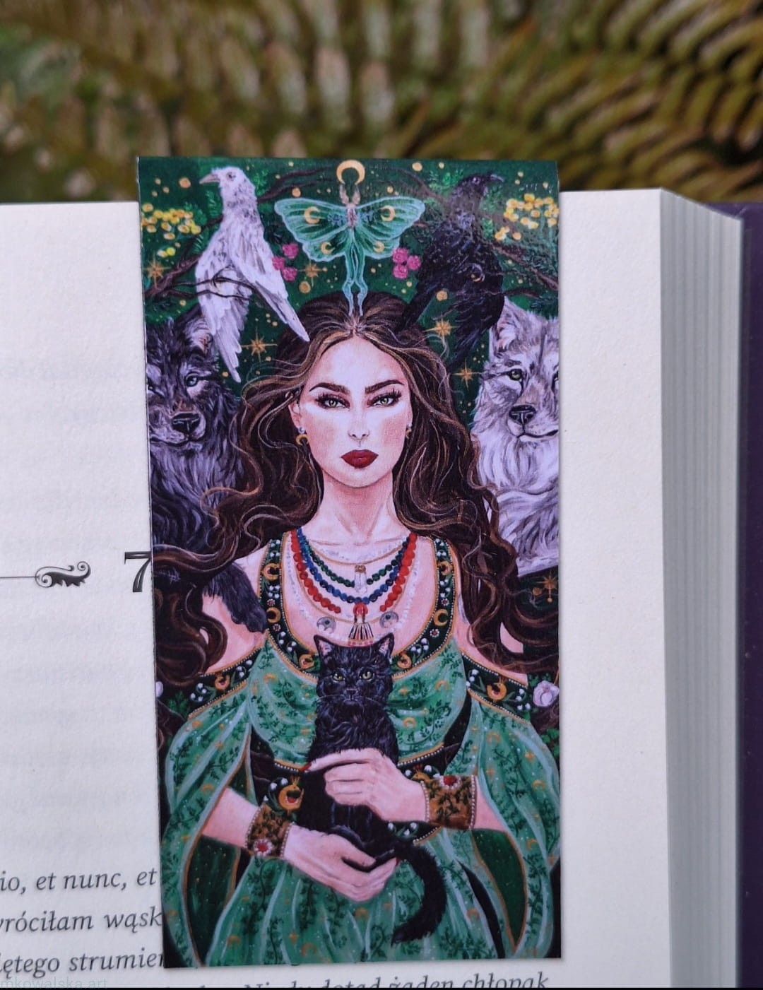 Znachorka, obraz stworzony w 2023 roku, format 100x100 cm. To moja malarska interpretacja znachorki (zielarki) i hołd oddany Matce Naturze. Na obrazie znajdziesz rośliny lecznicze takie jak: maliny (witamina C), wrotycz (działanie przeciwwirusowe, wykorzystywany też w kadzidłach), amanita muscaria (muchomor czerwony), czarny bez jako owoce i kwiaty (infekcje gónych dróg oddechowych), dziurawiec (zaburzenia trawienia, bezsenność), dzika róża (witamina C, działanie moczopędne), czosnek (naturalny antybiotyk). Słowo "znachor" składa się z dwóch członów: "znać" i "choroba", tłumaczymy je jako "osoba, znająca choroby". Na obraz znajdziesz również kruki i wilki (białe i czarne, jako przeciwwaga energii) czy czarnego kota - kojarzonego z istotą magiczną.