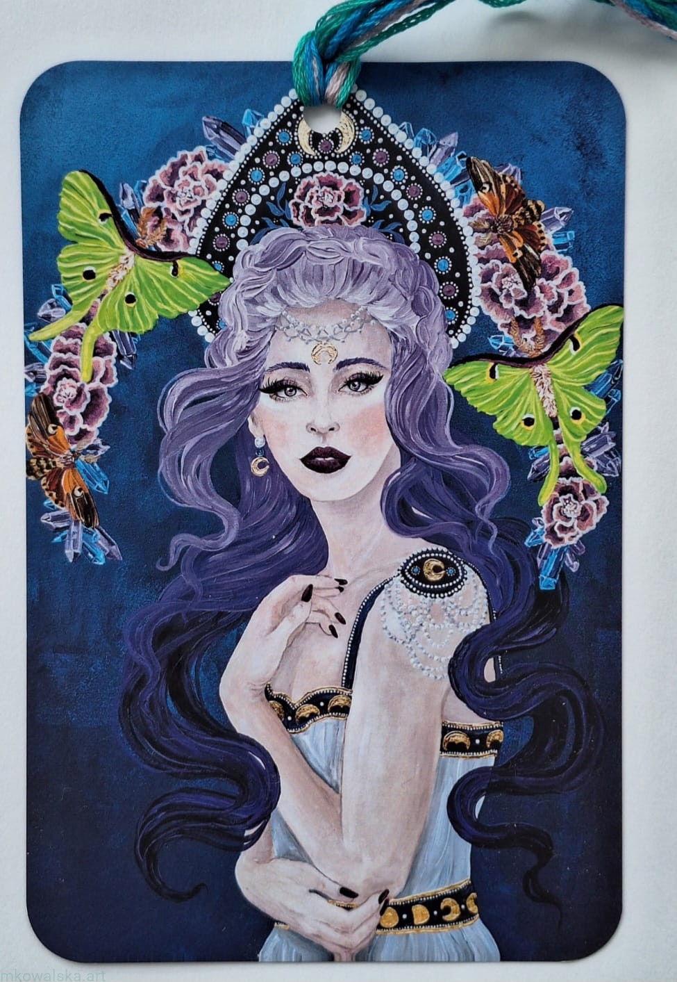 Lunula z fioletowymi włosami została namalowana w 2022 roku, format 80x80cm. To moja malarska interpretacja lunuli - czyli słowiańskiego symbolu kobiecości, mającego postać sierpu Księżyca skierowanego rogami w dół. To ważny kobiecy symbol, ukazujący połączenie cyklu menstruacyjnego kobiety z fazami Księżyca. Na obrazie symbol lunuli został stworzony z wiatów, kryształów i ciem. Ćma uważana jest w swej symbolice jako akt wiary: tak jak ćmy dążą do światła, tak Ty dąż do spełniania swoich życzeń.